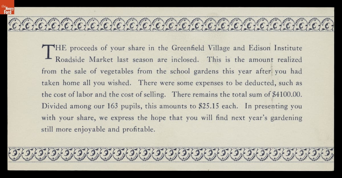 Letter to Edison Institute Schools Students about the Sale of Their School Garden Produce, 1936