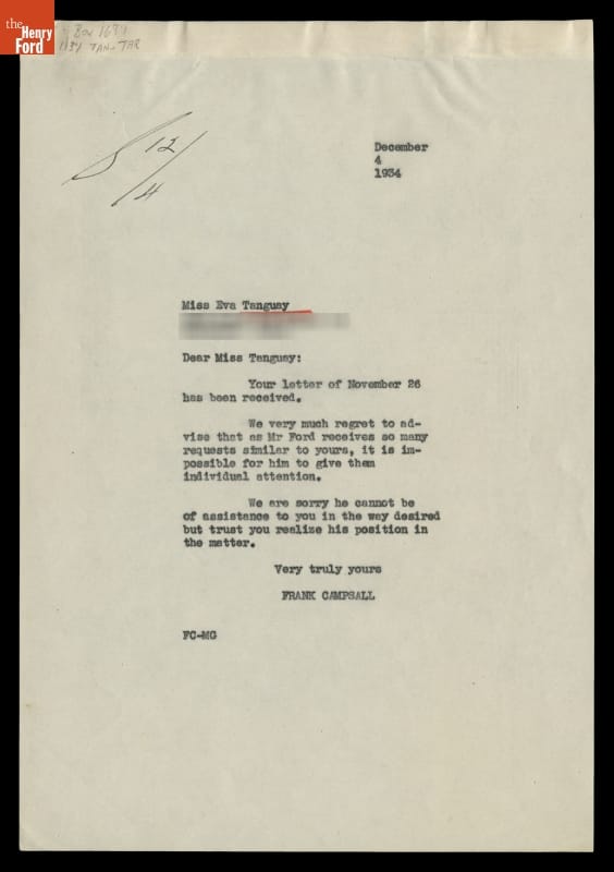 Letter to Eva Tanguay Rejecting Her Request for a Car from Henry Ford, December 4, 1934
