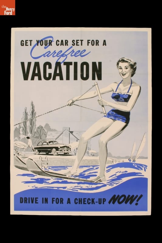 This advertising poster for Ford Motor Company reminds potential customers that maintaining their car beforehand can help ensure an enjoyable vacation trip.