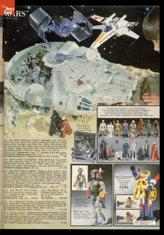 Star Wars toys and electronic games filled the pages of the 1979 Sears Wish Book. Of special interest to Star Wars fans was the Boba Fett figure available on page 619. The character's big-screen debut came in the 1980 movie The Empire Strikes Back. His Wish Book appearance offered a small preview of the much-anticipated sequel.