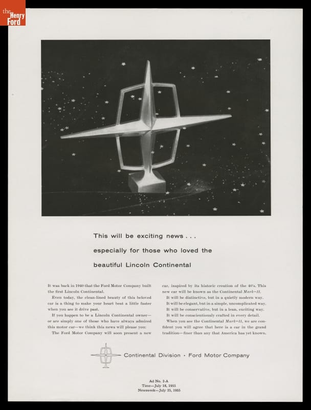 1956 Continental Mark II Advertisement, "This Will Be Exciting News Especially for Those Who Loved the Beautiful Lincoln Continental"