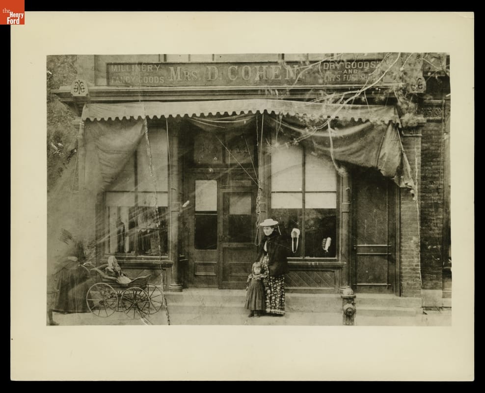 Mrs. Cohen's Millinery, a small urban specialty store located at 444 Baker Street in Detroit, as it appeared in the mid-1890s. Widowed Elizabeth Cohen (shown at center, with daughter) supported her young family by selling inexpensive, mass-produced headwear to her middle-class customers. Like other shopkeepers, Mrs. Cohen lived above her store--making it possible to handle both business and family responsibilities.