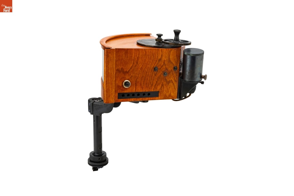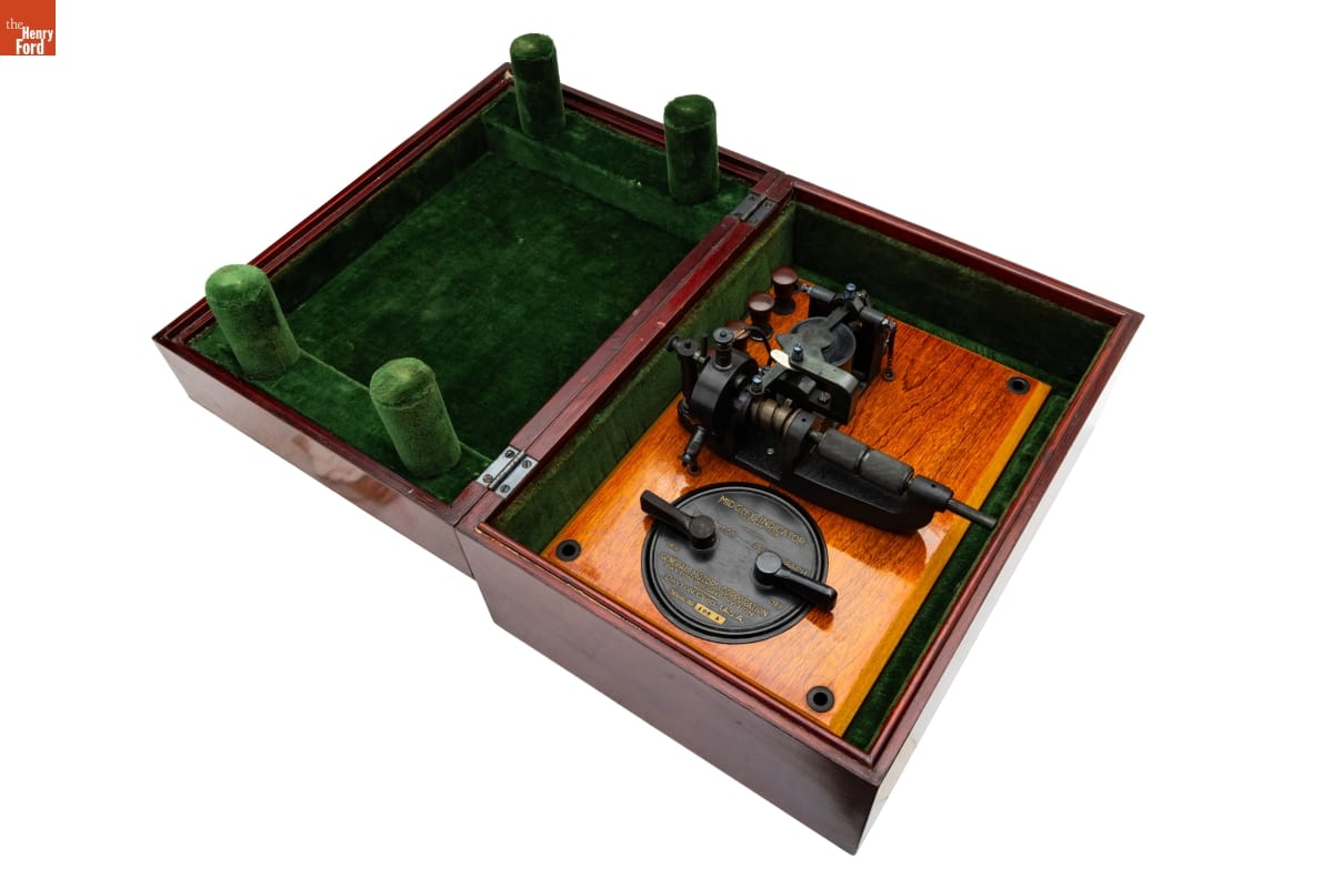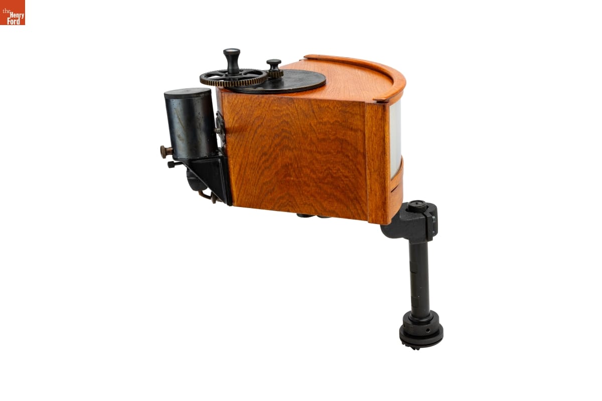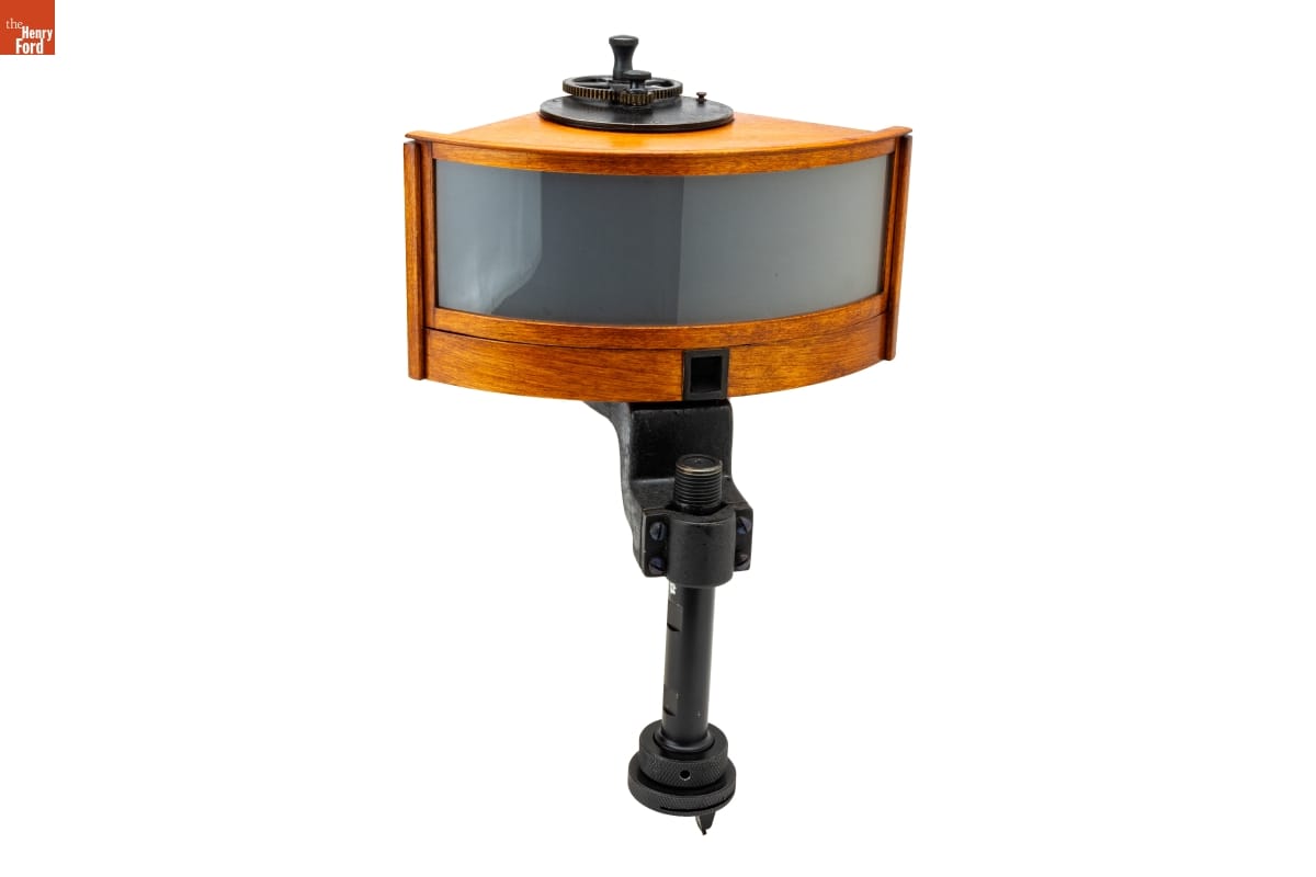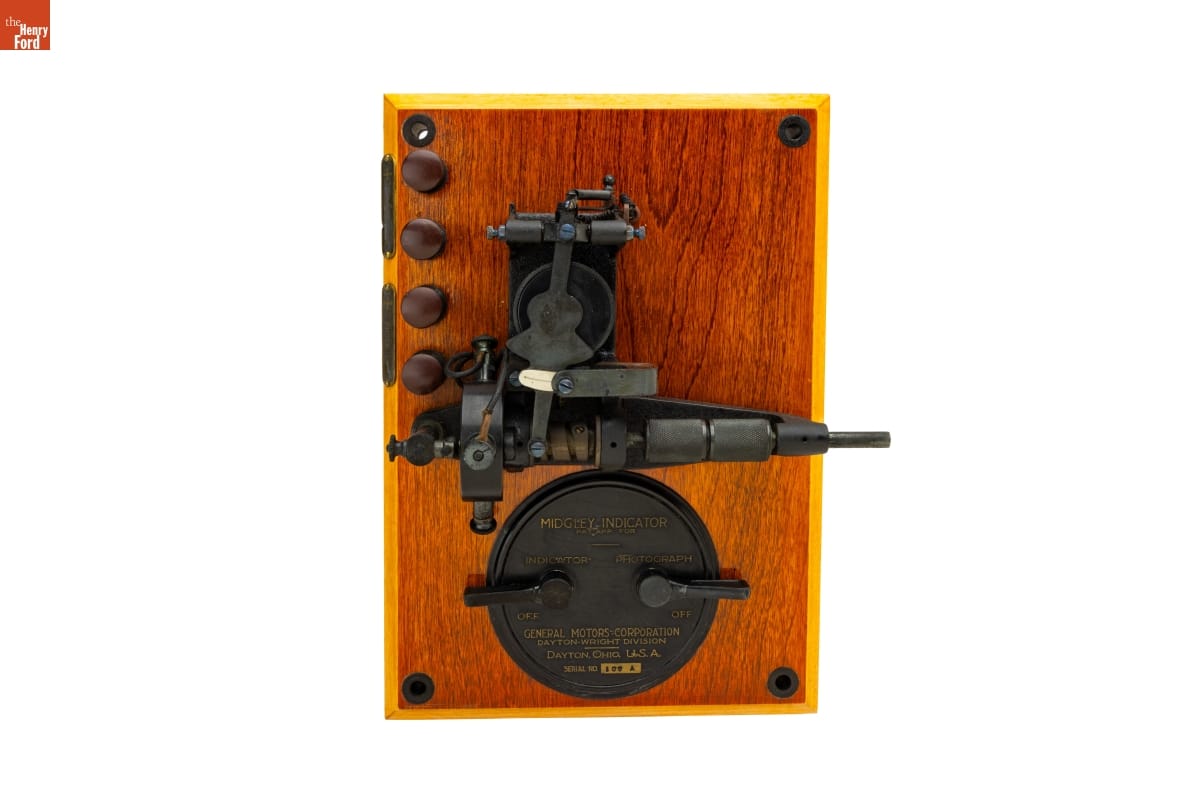In the early 1920s, engineer Thomas Midgley worked with General Motors research head Charles Kettering to reduce engine knocks caused by uneven burning of gasoline in automobile engines. Midgley developed this indicator to measure engine cylinder pressure. The device recorded its readings on photosensitive paper. Midgley and Kettering ultimately discovered that adding tetraethyl lead to gasoline prevented knocks.