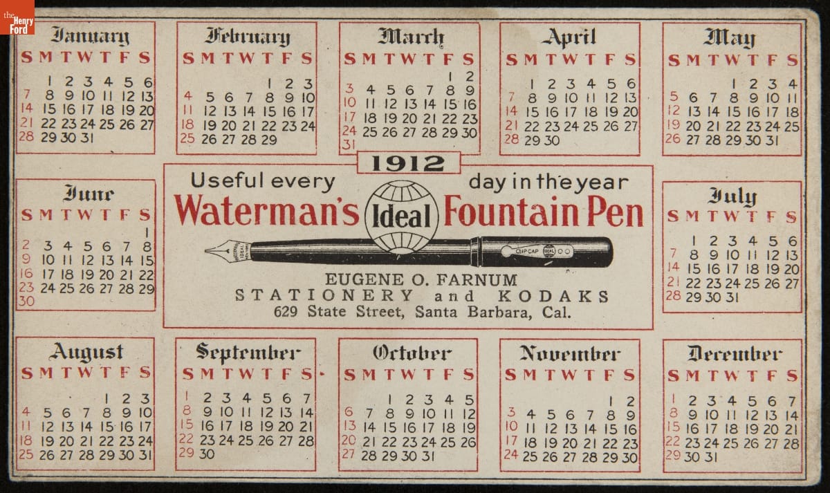1912 / Useful every day of the year / Waterman's Ideal Fountain Pen / Eugene O. Farnum / STATIONERY and KODAKS / 629 State Street, Santa Barbara Ca.