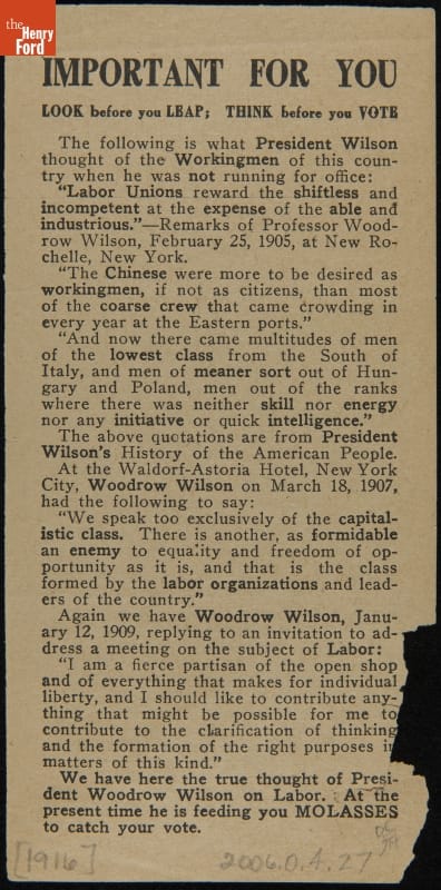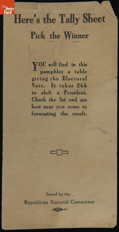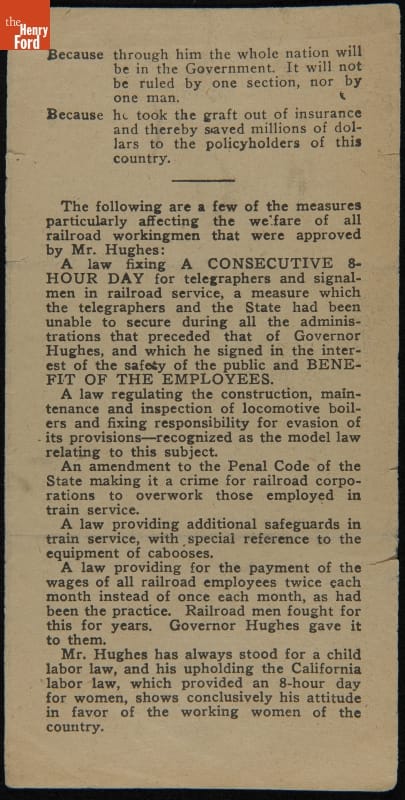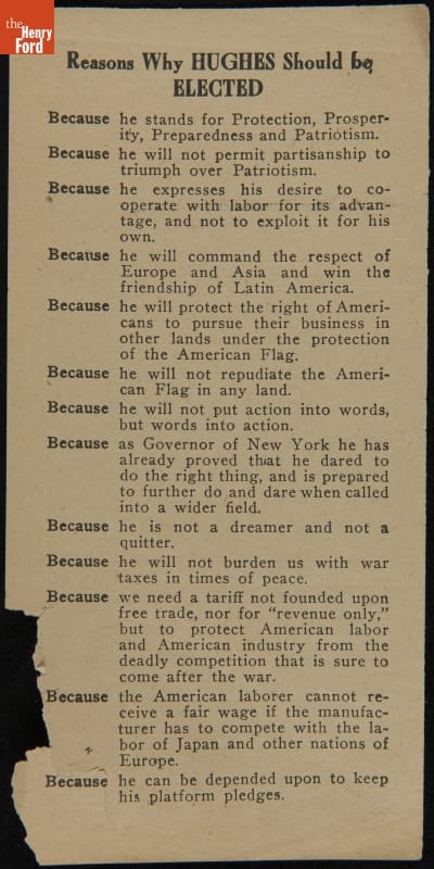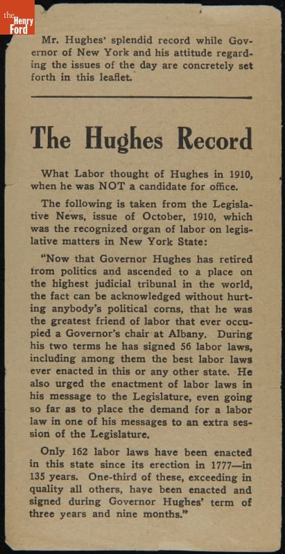 In 1916, Republicans nominated Charles Evans Hughes for president. Hughes, an Associate Justice of the Supreme Court, appealed to Republican leaders looking to unite the party after its conservative-progressive split in 1912. This brochure touted Hughes' progressive labor record--a tactic to lure voters away from Democrat Woodrow Wilson, the equally progressive incumbent president. It almost worked--Hughes narrowly lost.