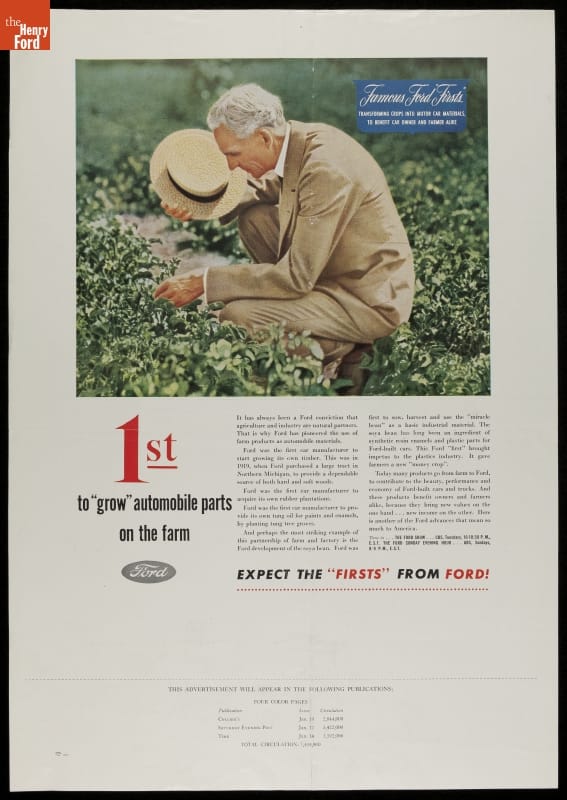 Featuring company founder Henry Ford, this national advertising campaign includes views that he promoted beginning in early 1928: "Transforming Crops into Motor Car Materials, to Benefit Car Owner and Farmer Alike." In 1931, Henry Ford decided to experiment with soybeans, and by 1933 produced oil for paints and molded ground meal into small plastic car parts, like gear shift knobs.