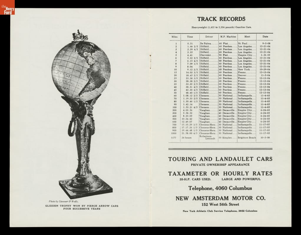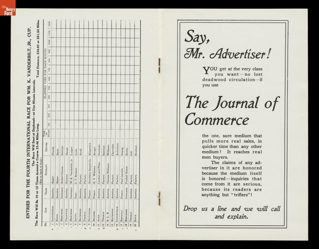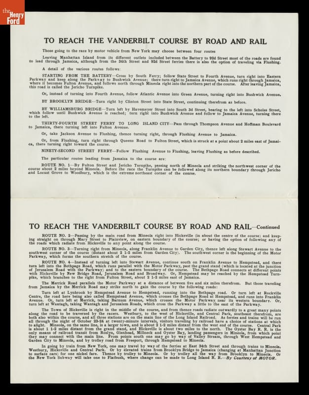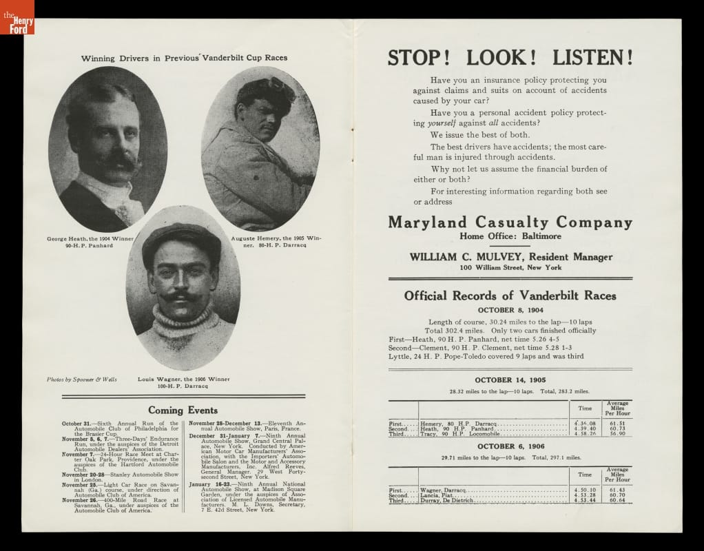 William K. Vanderbilt, Jr., launched America's first great automobile race, the Vanderbilt Cup, in 1904. Top American and European drivers and cars came to Long Island, New York, for the annual event. After three consecutive victories by French cars, an American-built Locomobile won in 1908. Driver George Robertson and mechanician Glenn Ethridge earned the prize with their car "Old 16."