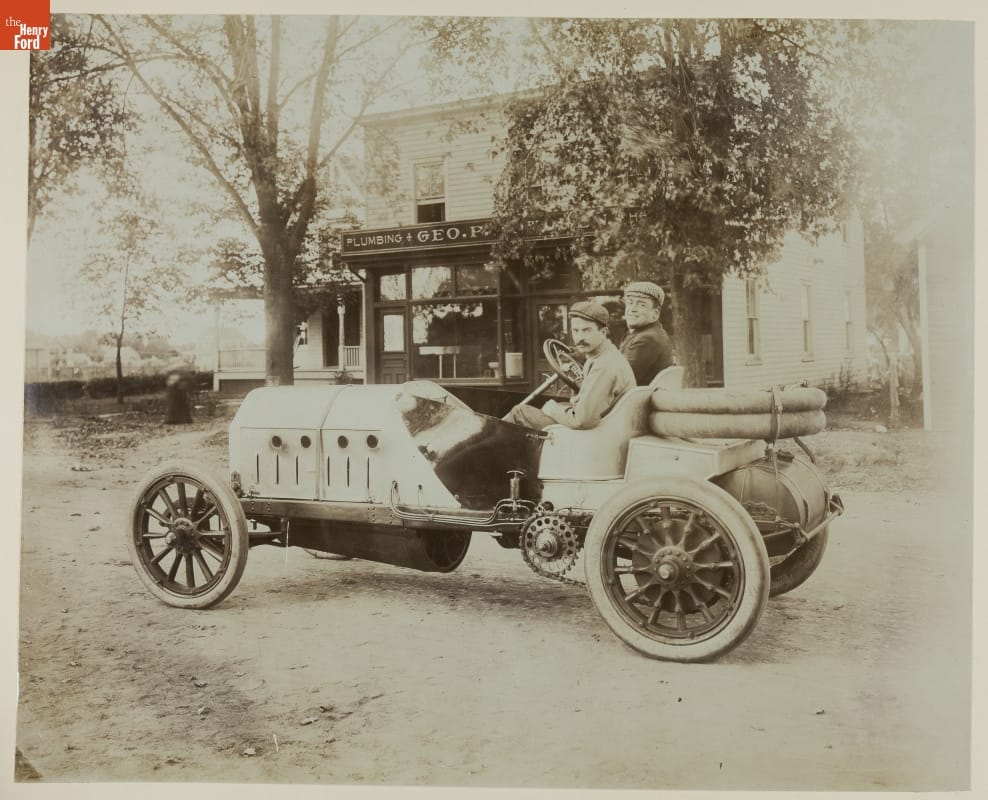 Vincenzo Lancia and Mechanic, Posing in Fiat Race Car, Vanderbilt Cup Races, Long Island, New York, 1906