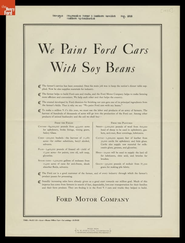 Advertisement for the 1935 Ford, "We Paint Cars with Soy Beans"