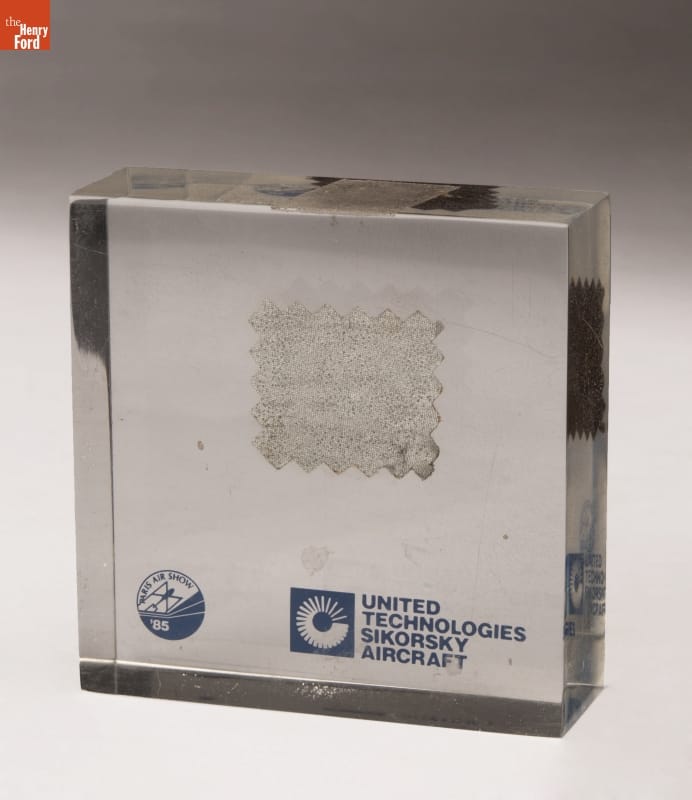 Igor Sikorsky's VS-300, built in 1939, was the first practical helicopter developed and flown in the United States. Sikorsky donated it to The Henry Ford in 1943. When the helicopter was refurbished by United Technologies Sikorsky Aircraft in 1984, pieces of its original fabric covering were mounted into commemorative paperweights -- symbolic tributes to the VS-300's technological significance.