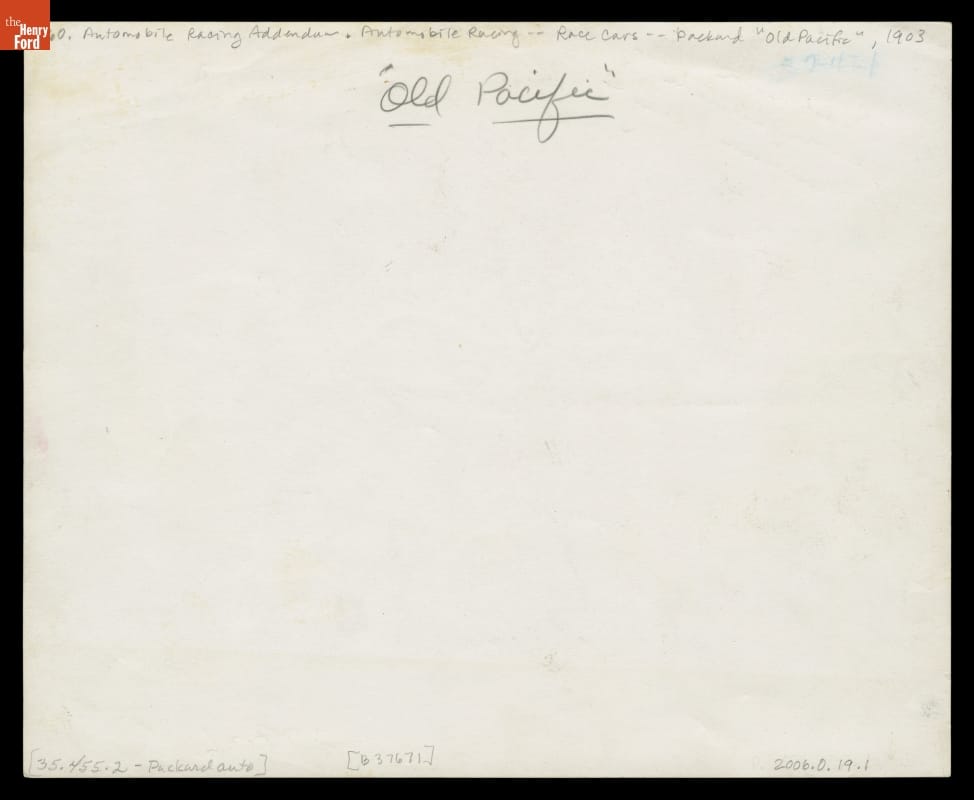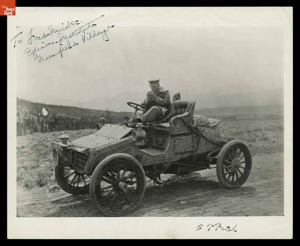 In 1903, two men drove a Packard Model F nicknamed "Old Pacific" from San Francisco to New York. It was the second automobile to complete the epic journey. Few roads stretched west of the Mississippi, and if the men encountered a problem, they had to solve it themselves. This photograph shows a desolate landscape, the dust-covered Packard, and E.T. "Tom" Fetch.