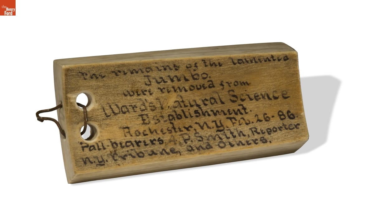 The remains of the lamented / jumbo / were removed from / Ward's Natural Science / Establishment. / Rochester, N.Y. Feb. 26-86. / pall bearers A.P. Smith, Reporter / N.Y. Tribune, and others.