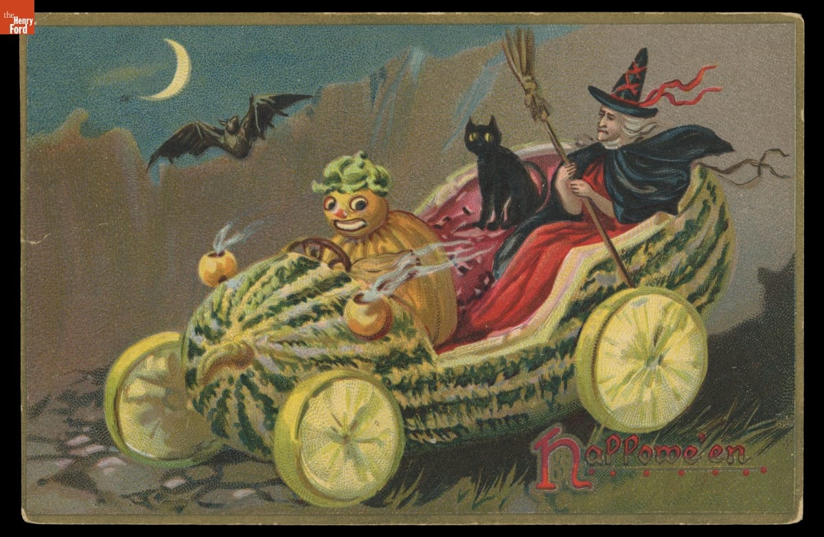 Halloween's superstitious origins gave way to a national celebration of mystery and innocent fun in 20th-century America. Seasonal greeting cards commonly exchanged by friends and neighbors during Halloween reflected a distinctly American blend of olden customs and modern life. This colorful example cleverly combines traditional symbols with a contemporary watermelon "automobile" - complete with a hand crank stem!