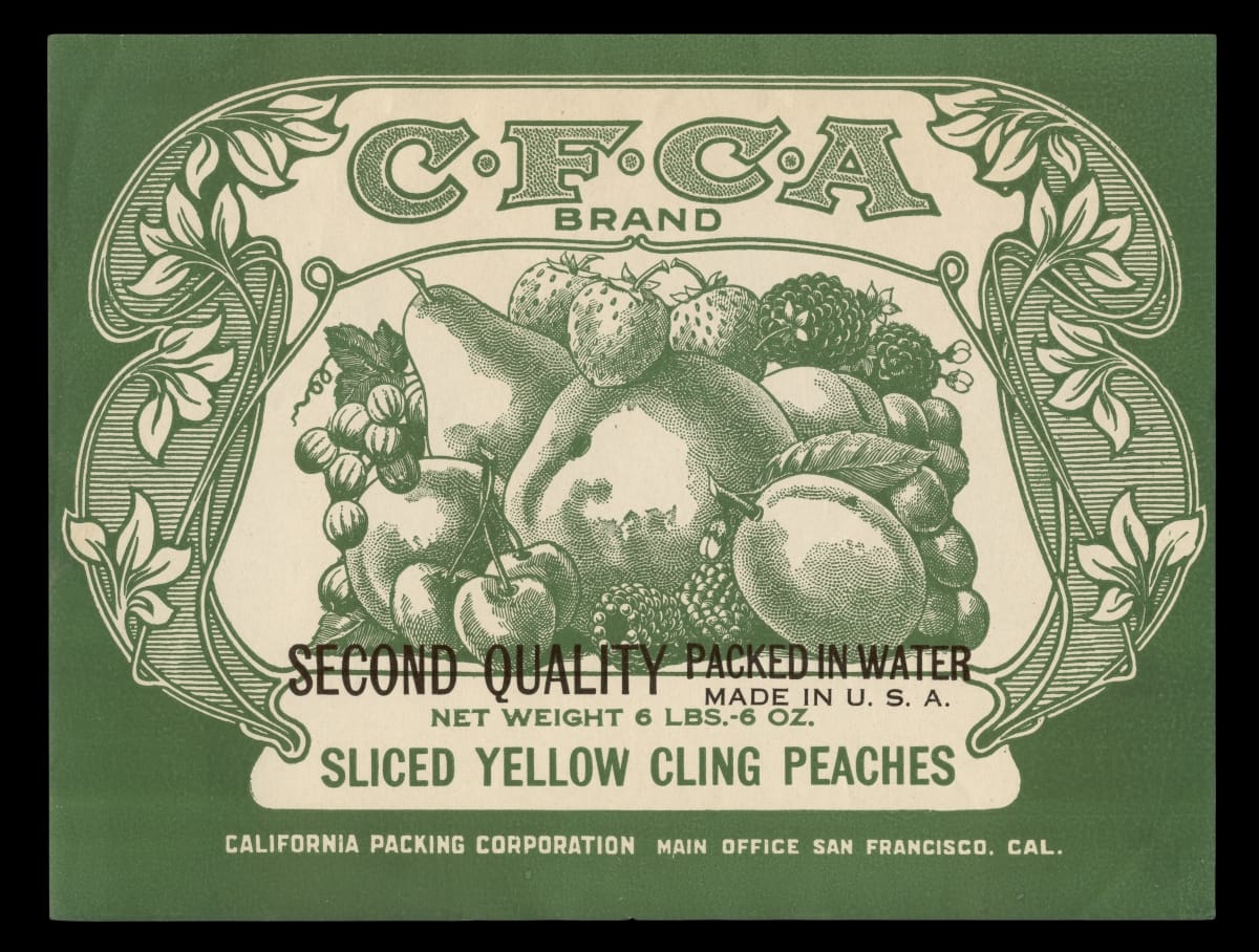 In 1869, the transcontinental railroad opened eastern markets to the West Coast produce industry for the first time. As produce companies shipped crates of fruits and vegetables across the country, they needed a way to distinguish their goods from their competitors'. Colorful, eye-catching labels, like this one for C.F.C.A. Brand Sliced Yellow Cling Peaches, were created to attract grocers purchasing goods from wholesale markets.