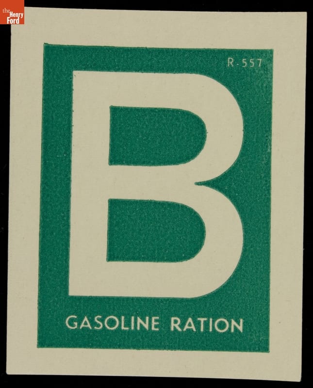 The amount of gasoline you received during World War II depended on whether your job was essential to the war effort. Drivers received a windshield sticker and ration coupons for gasoline. Essential war workers received "B" stickers, like this one, allowing them up to eight gallons of gasoline a week.