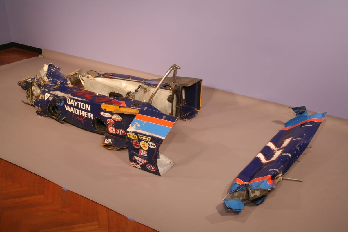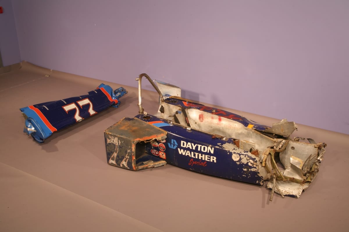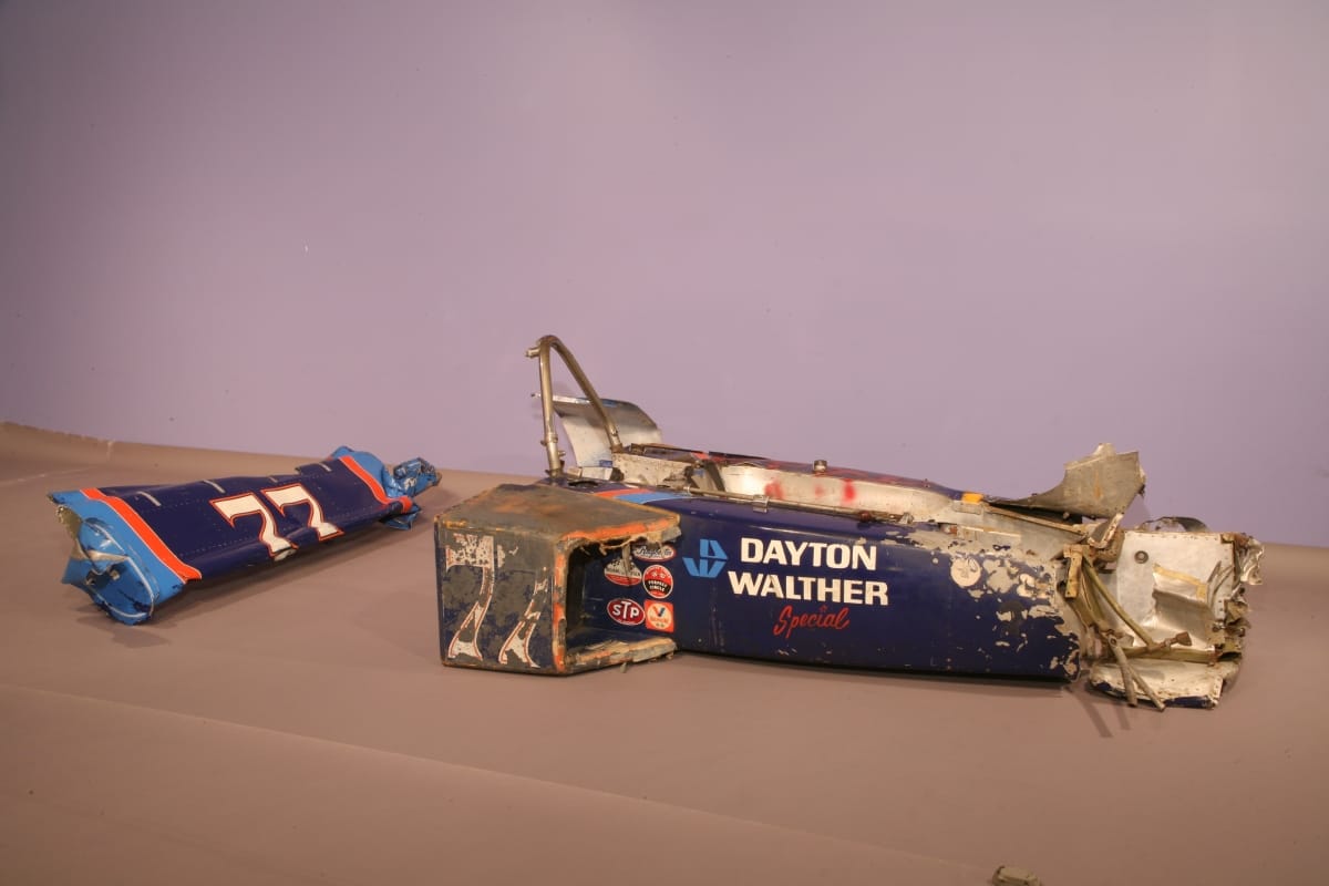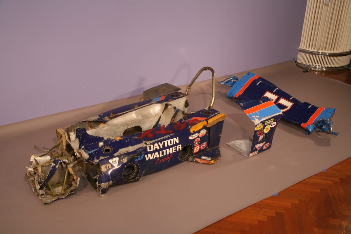This hulk is what remains from one of the worst crashes in Indianapolis 500 history. On the first lap of the 1973 race, David "Salt" Walther's car crashed into the outside wall, exploded, and overturned. Though badly burned, Walther survived. After a lengthy rehabilitation, he returned to compete at Indy the following year.