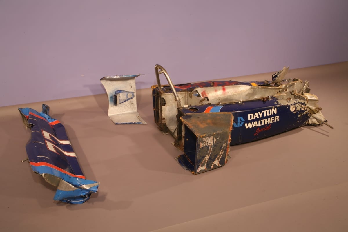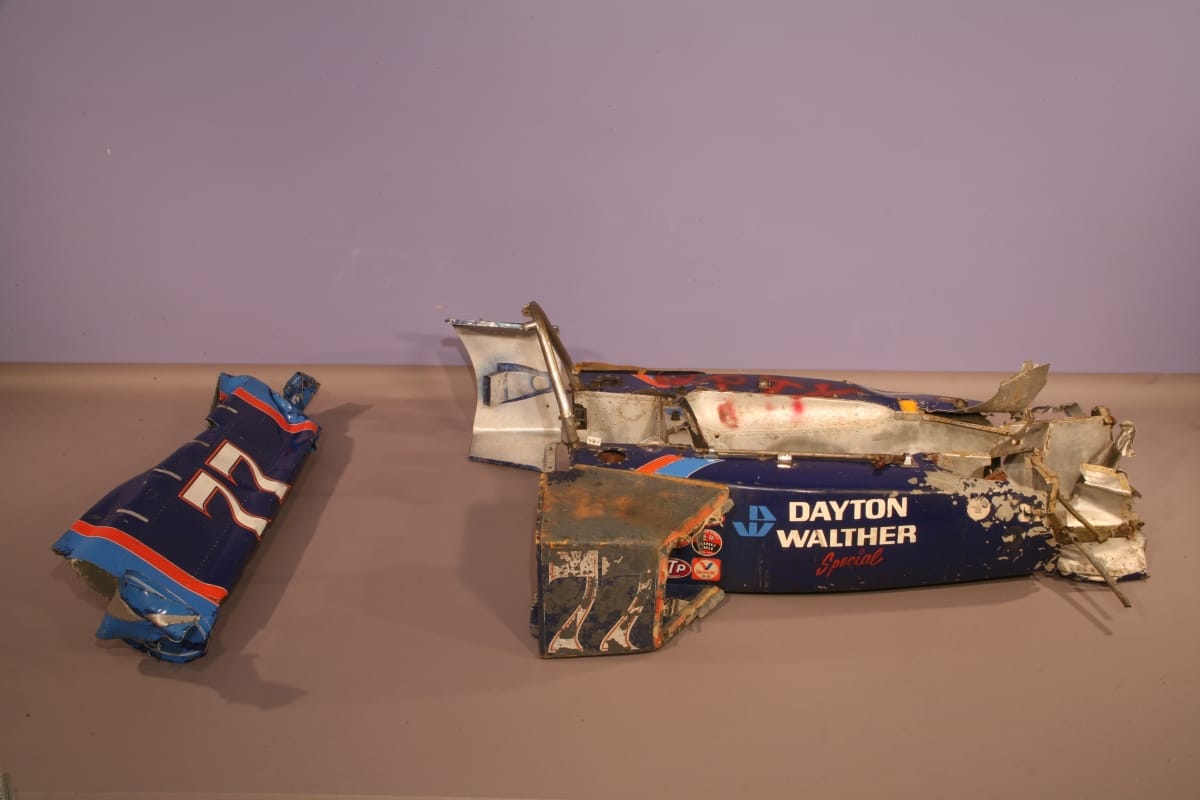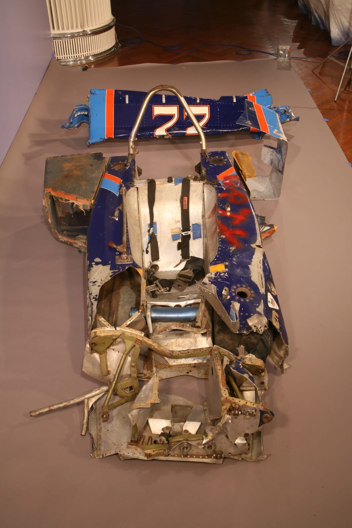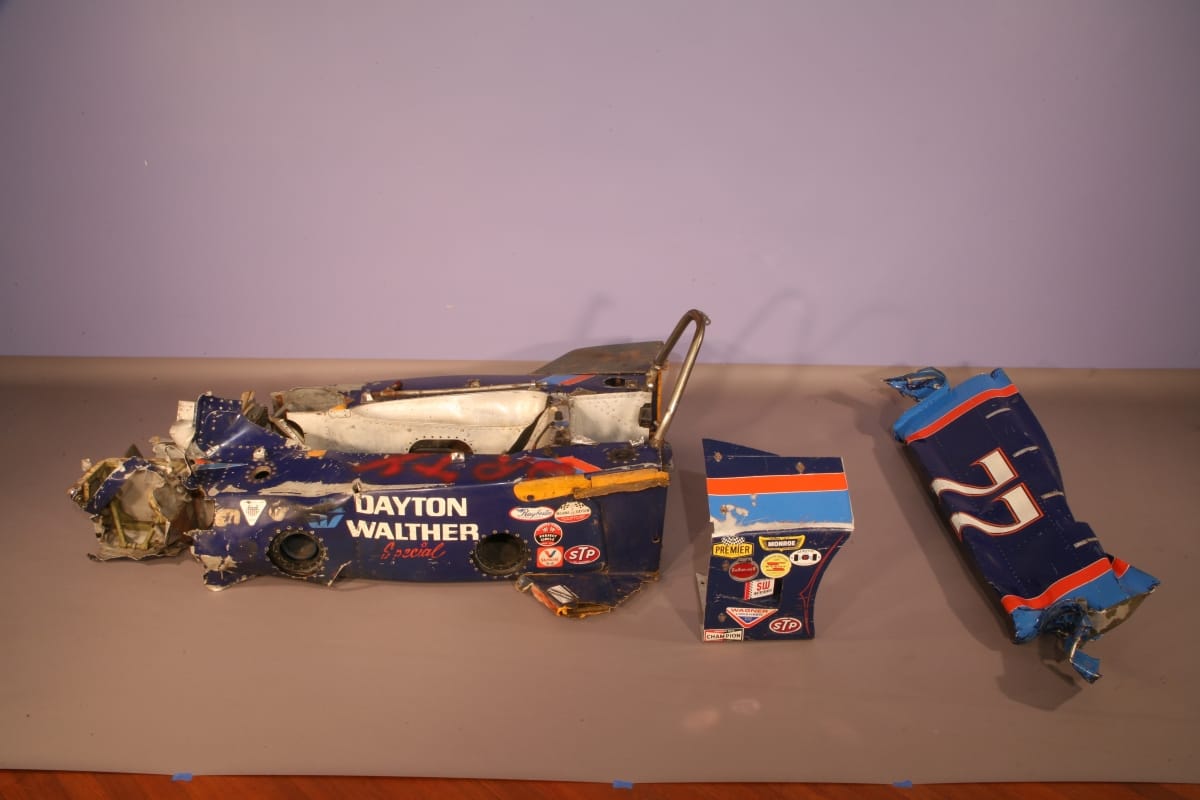 This hulk is what remains from one of the worst crashes in Indianapolis 500 history. On the first lap of the 1973 race, David "Salt" Walther's car crashed into the outside wall, exploded, and overturned. Though badly burned, Walther survived. After a lengthy rehabilitation, he returned to compete at Indy the following year.