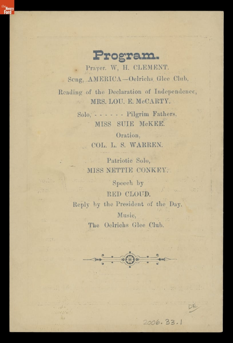 The citizens of Oelrichs, South Dakota, celebrated the Fourth of July in 1890 with races, a baseball game, speeches, and a celebratory ball. A morning procession featured a band, local officials, and a group of Lakota (Sioux) led by Mahpíya Lúta (Red Cloud). Mahpíya Lúta, who successfully fought against the United States in the 1860s and later advocated for peace, was also one of the featured speakers.
