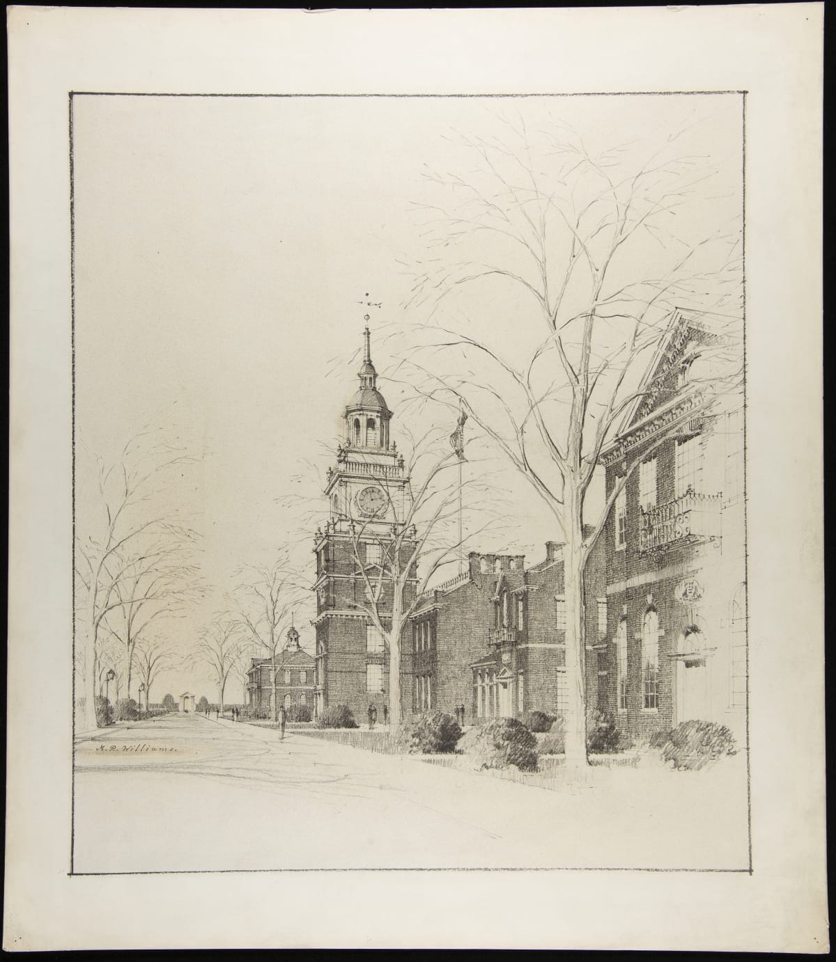 One of a series of views of the Museum as built, this black and white drawing shows the front façade of the Museum. A reproduction of Independence Hall is at the center, but the entire building was reproduced in reverse, with the clock tower as the focal point. This concession to history serves to provide balance to the extended series of buildings which comprise the front of the Museum.