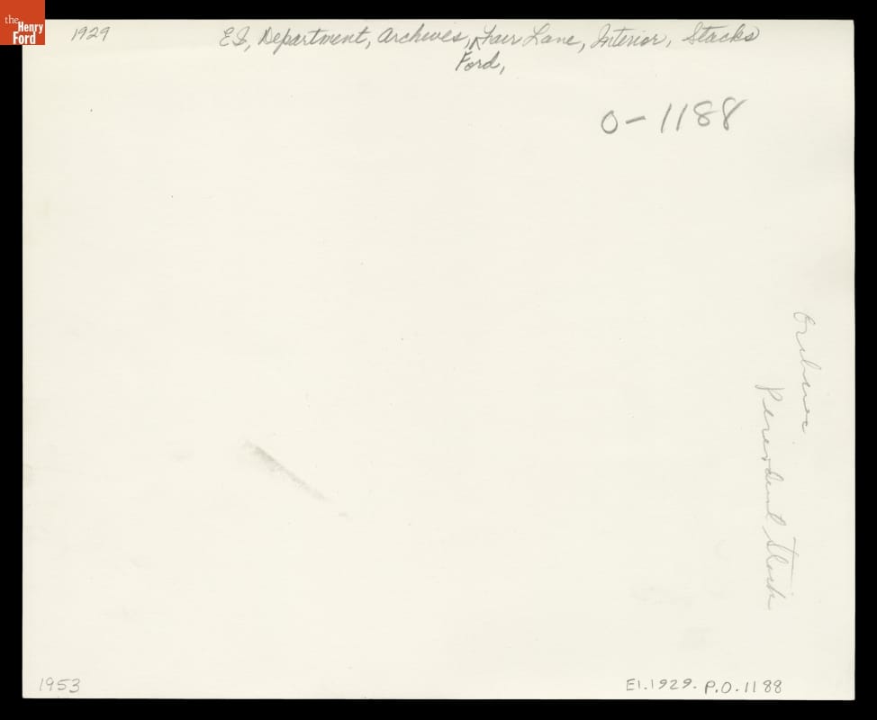As Ford Motor Company prepared for its 50th anniversary in 1953, staff established a corporate archive at founder Henry Ford's former estate in Dearborn, Michigan. (Ford and his wife Clara had passed away in 1947 and 1950, respectively.) The collection moved to another location in 1957 and would ultimately be housed at the Edison Institute--today known as The Henry Ford.