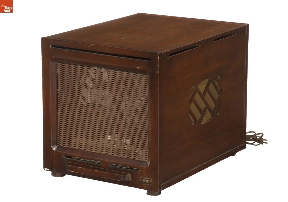 This tabletop television was manufactured by underdog inventor Philo Farnsworth. Its model name--the Modern--refers to its simplistic, boxy cabinetry, as well as its compactness. Despite pierced speaker grills that resonate with radio design, it is distinctly single-function. It resists the tendency of combining household technologies into concealed cabinets. The Modern stands alone, plainly-stated and defiantly free of decoration.
