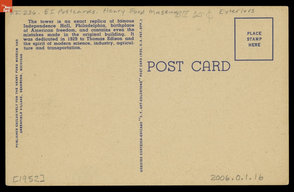 Postcard, "Museum Tower, The Henry Ford Museum," 1952