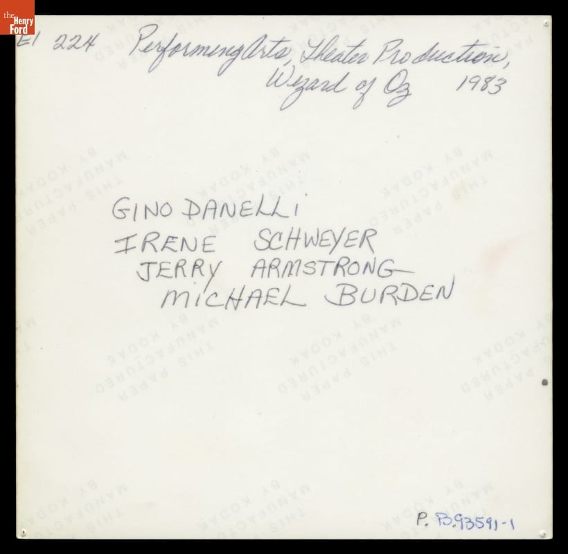 The actors' names are written on back of the photo: Gino Danelli [the Cowardly Lion], Irene Schweyer [Dorothy], Jerry [Gerald] Armstrong [the Tin Woodman], and Michael Burden [the Scarecrow].