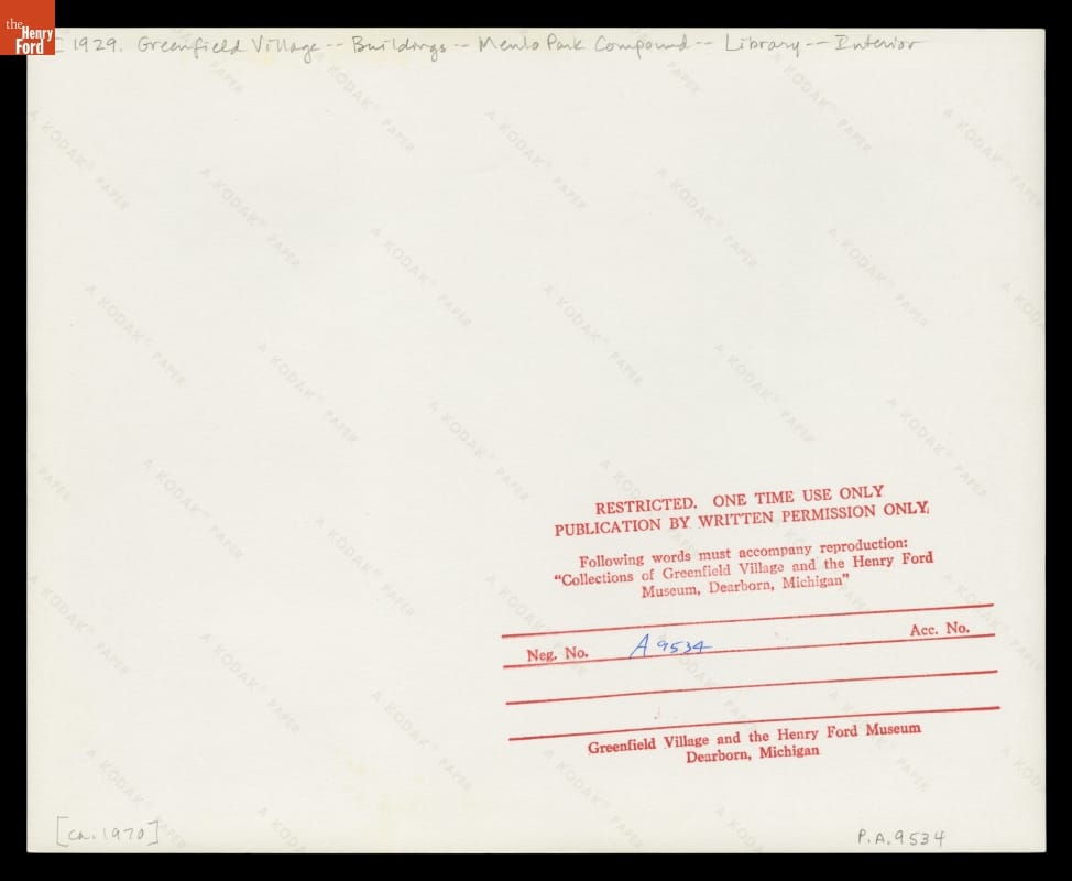 Interior of Menlo Park Library, Greenfield Village, circa 1970