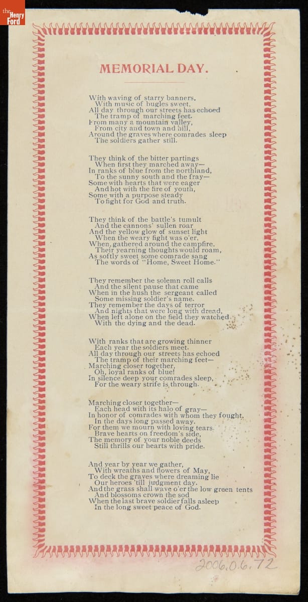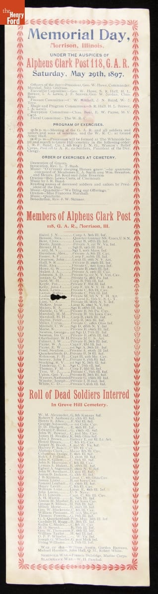 This 1897 pamphlet details the schedule for a Memorial Day service organized by an Illinois post of the G.A.R. (an organization for Union Civil War veterans). Veterans traveled from the Grand Army Hall to the cemetery, where they decorated the graves of fallen Civil War soldiers. Prayers, speeches, music, and a formal reading of names ended the solemn graveside services.