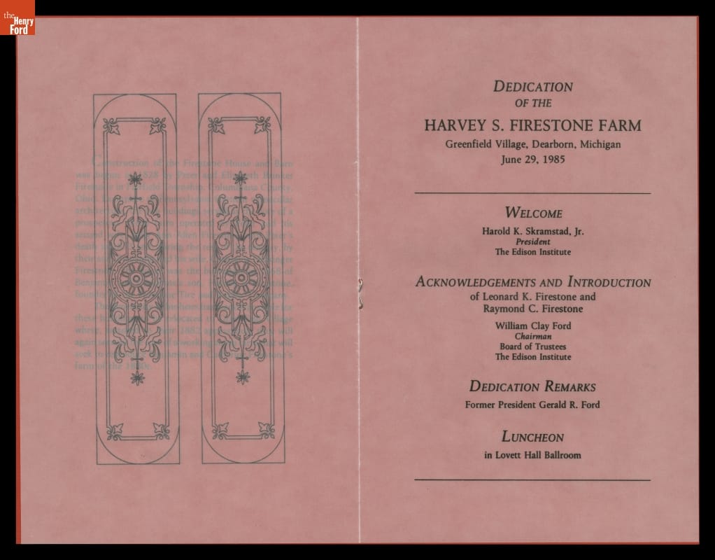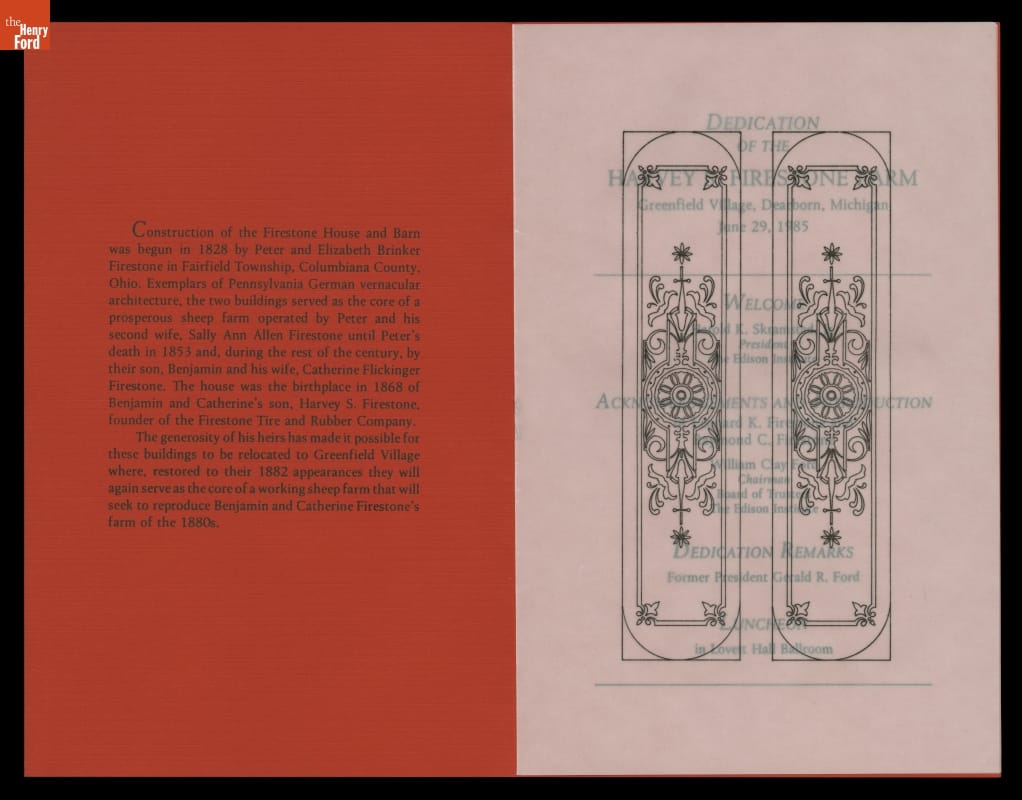 Program of Events for the Dedication of the Harvey S. Firestone Farm in Greenfield Village," June 29, 1985