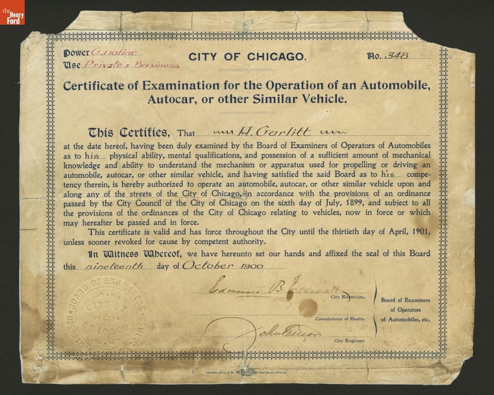 Certificate for Driving an Automobile in Chicago, Illinois, 1900