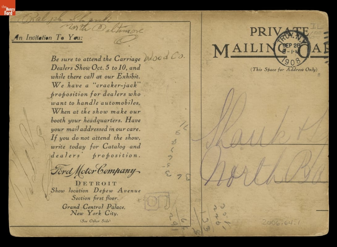 This postcard was sent just before the introduction of the Ford Model T on October 1, 1908. Ford exhibited at the Carriage Dealers Show, held annually in New York City. Ford's proposition was probably to entice dealers to sell the Model T. Postcards like this are very ephemeral and we are lucky to have this piece.