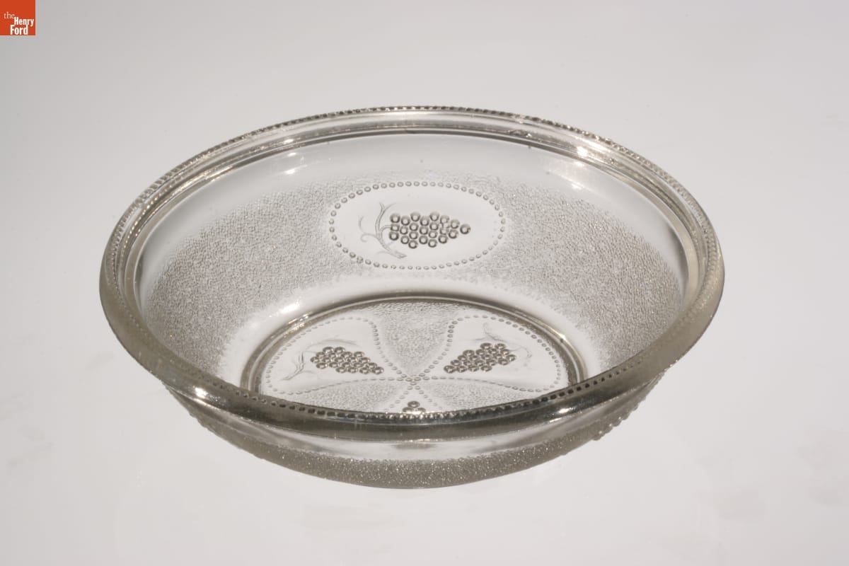 The Boston Silver Glass Company was established in East Cambridge, Massachusetts, in about 1857. Starting in 1869, the company produced pressed glass tableware in its "beaded grape medallion" pattern. The inexpensive glassware came in various forms: plates, dishes, bowls, compotes, goblets, and pitchers, among others. The company operated until about 1871.