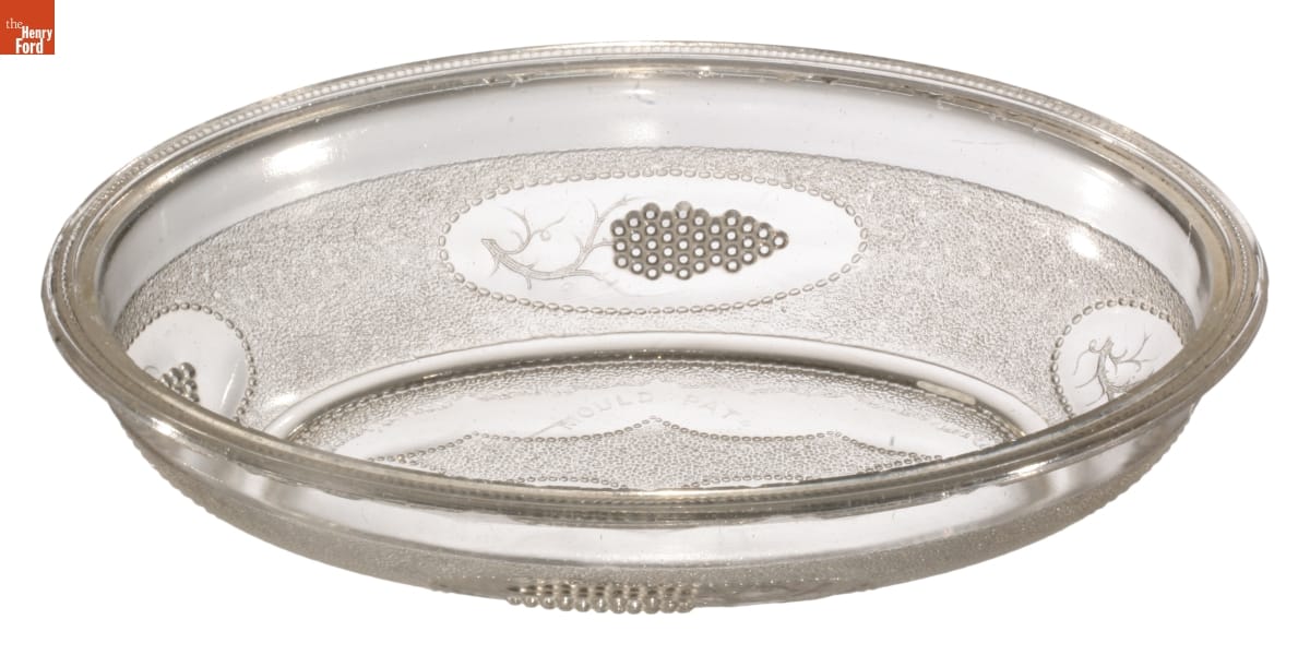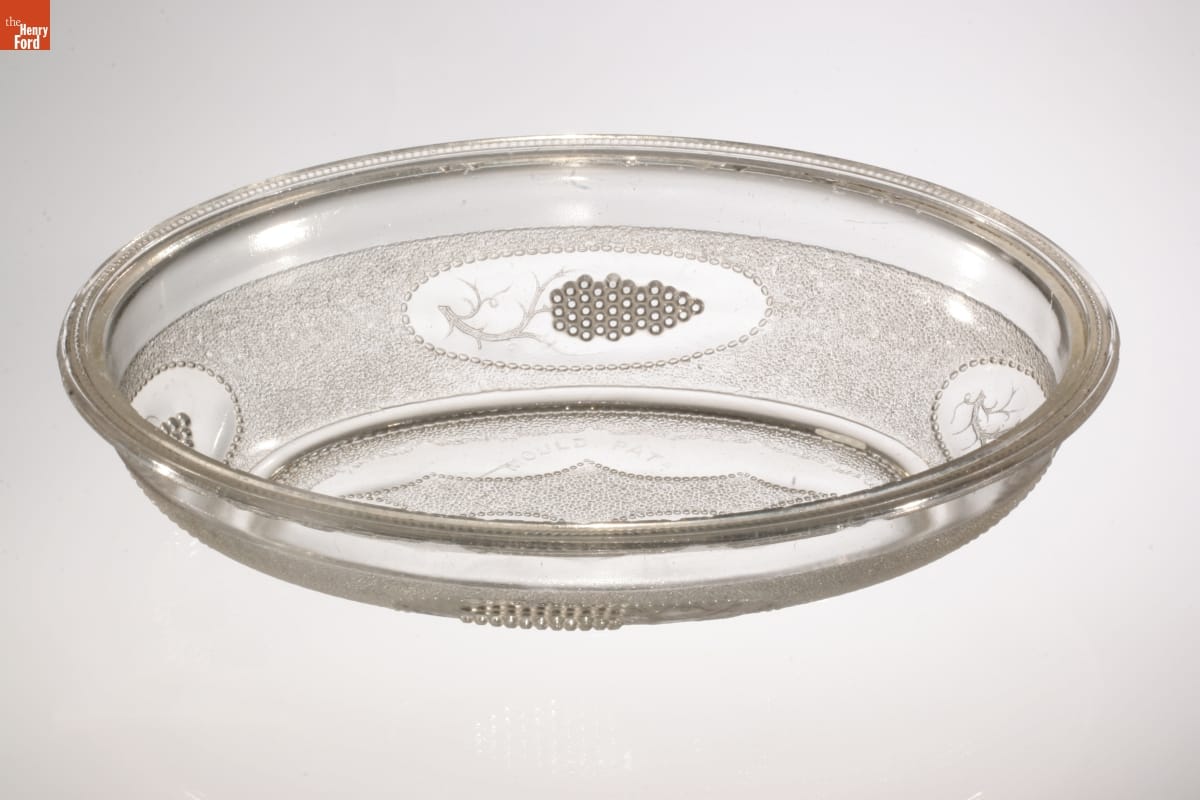 The Boston Silver Glass Company was established in East Cambridge, Massachusetts, in about 1857. Starting in 1869, the company produced pressed glass tableware in its "beaded grape medallion" pattern. The inexpensive glassware came in various forms: plates, dishes, bowls, compotes, goblets, and pitchers, among others. The company operated until about 1871.