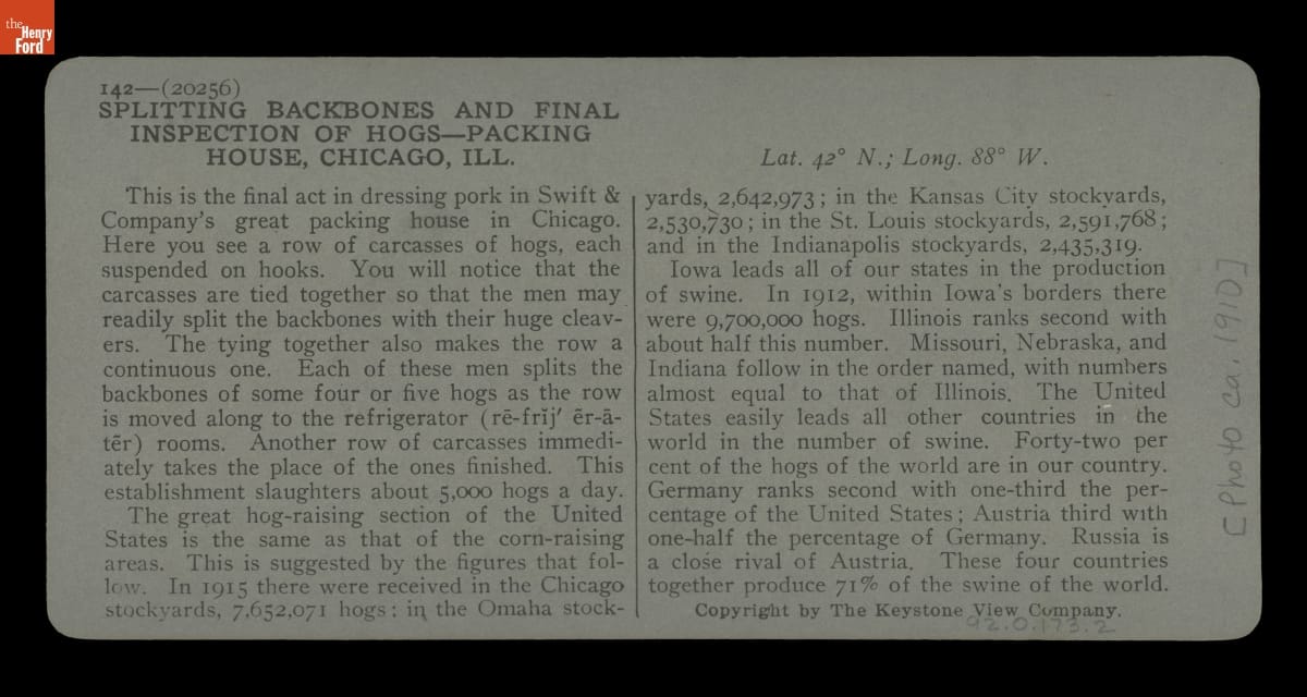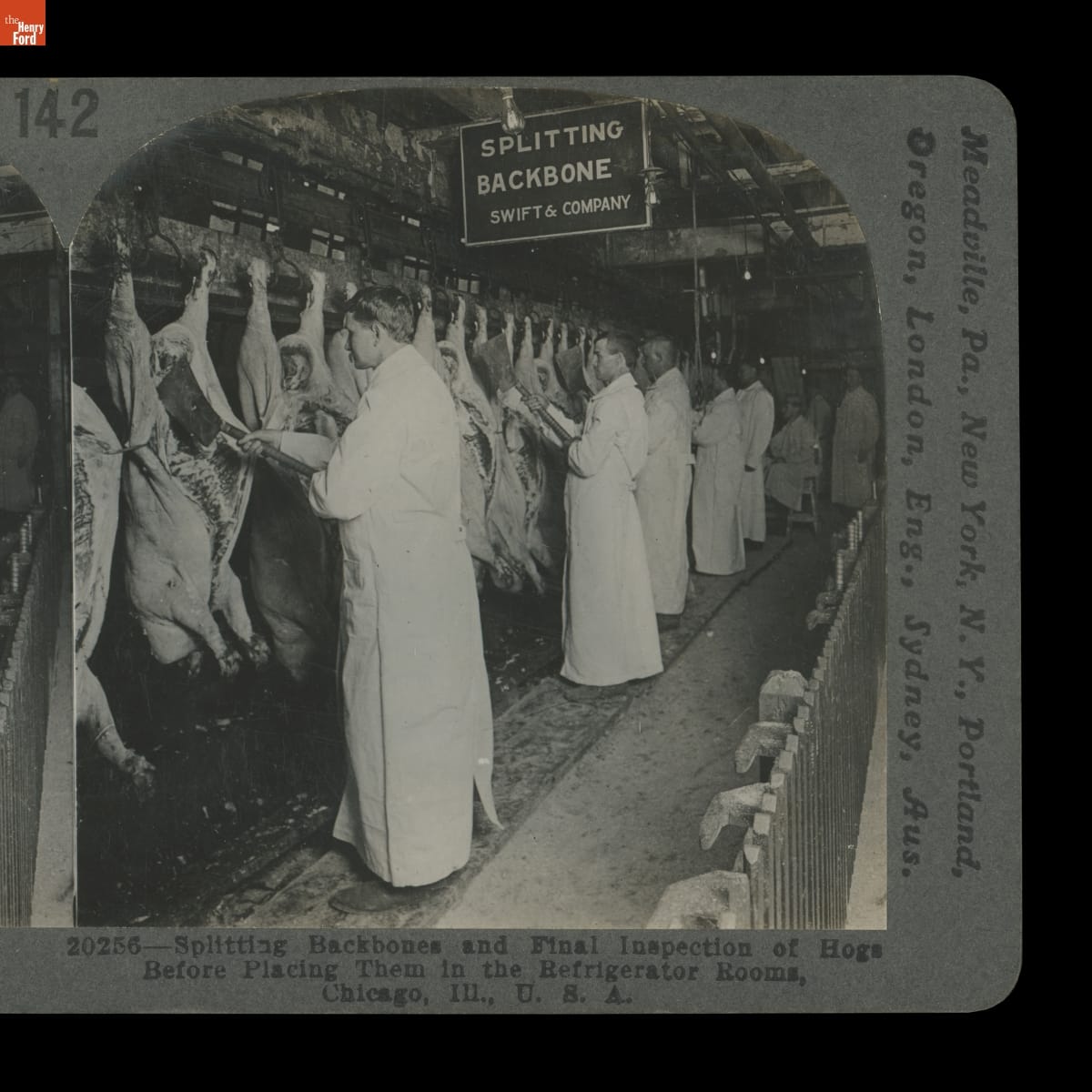 Swift & Company's Meat Packing House, Chicago, Illinois, "Splitting Backbones and Final Inspection of Hogs," 1910-1915