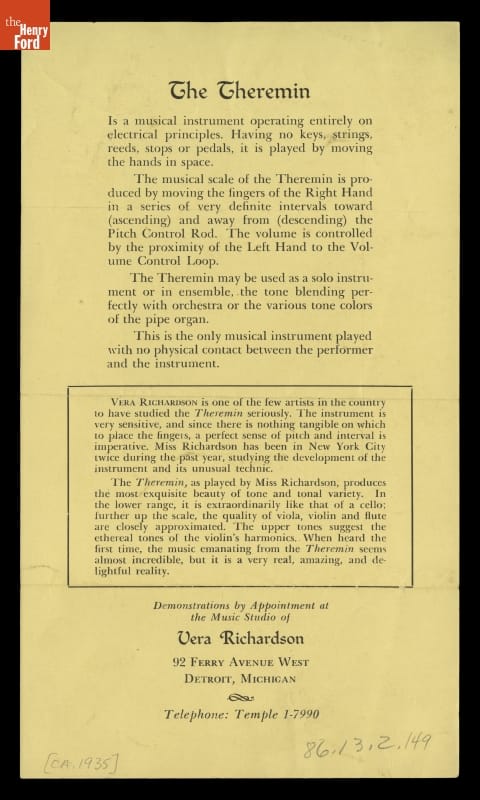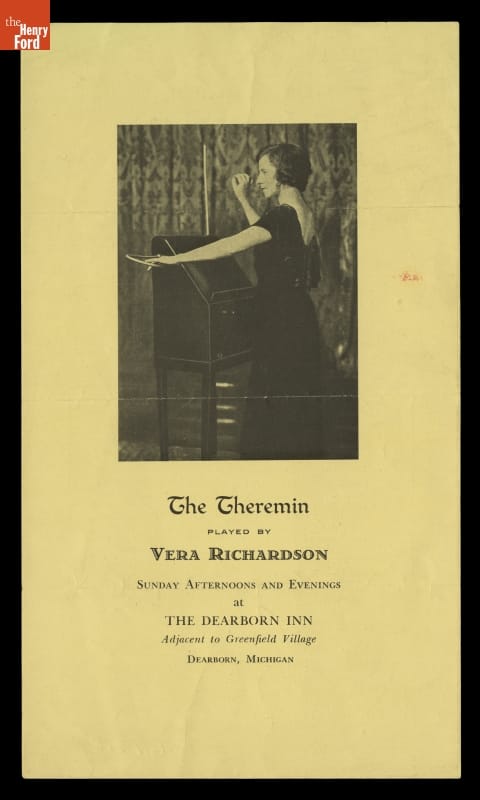 Vera Richardson was a respected Detroit musician known for her accomplishments playing the theremin. The theremin is played by moving one's hands near the instrument's antennas; there is no physical contact. Richardson ran a music studio out of her home and from 1936-52 she played the theremin on "The Green Hornet" radio series. During the 1930s Richardson gave performances at the Dearborn Inn.