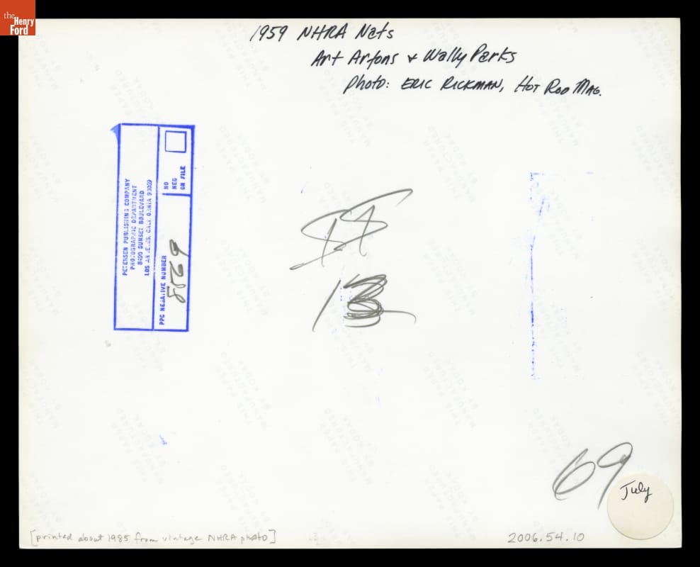 Art Arfons and Wally Parks with the Trophy for Top Speed, NHRA Nationals, Detroit Dragway, 1959