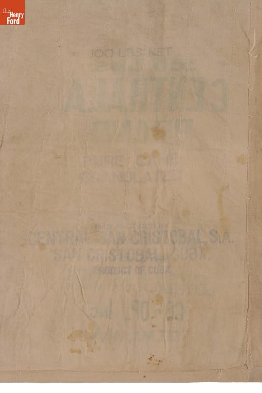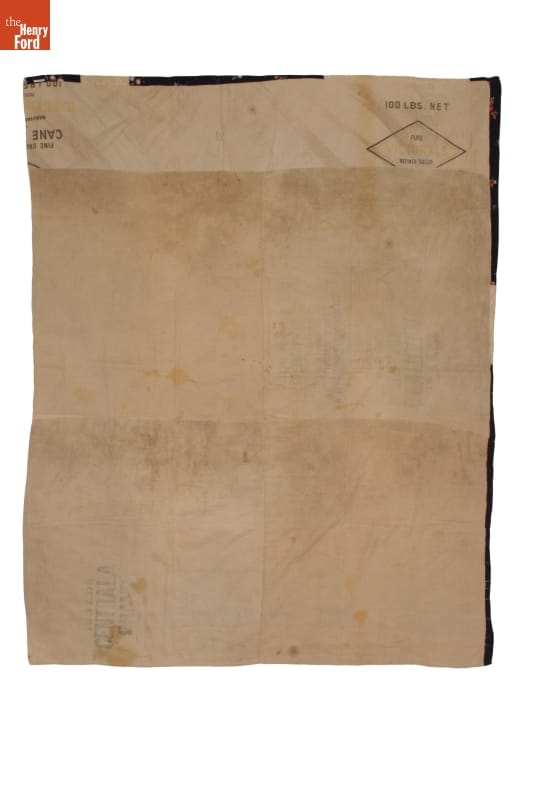 Text on feed sack on quilt back; reverse of sack text visible through back as well: 100 LBS NET / PURE CANE / GRANULATED / MANUFACTURED BY / CERTRAL SAN CRISTOBAL, S.A. / SAN CRISTOBAL, CUBA. / PRODUCT OF CUBA