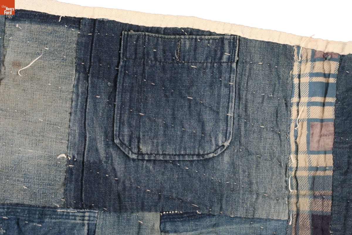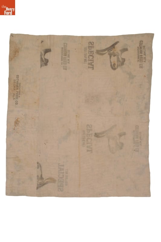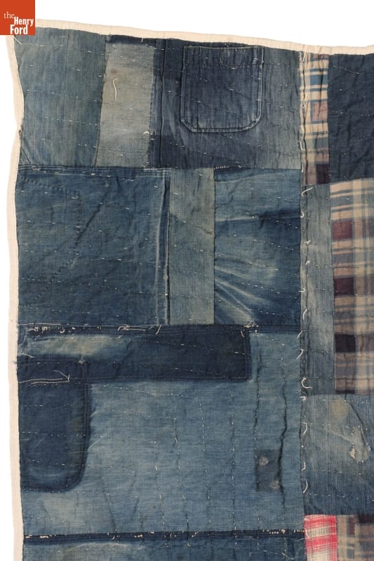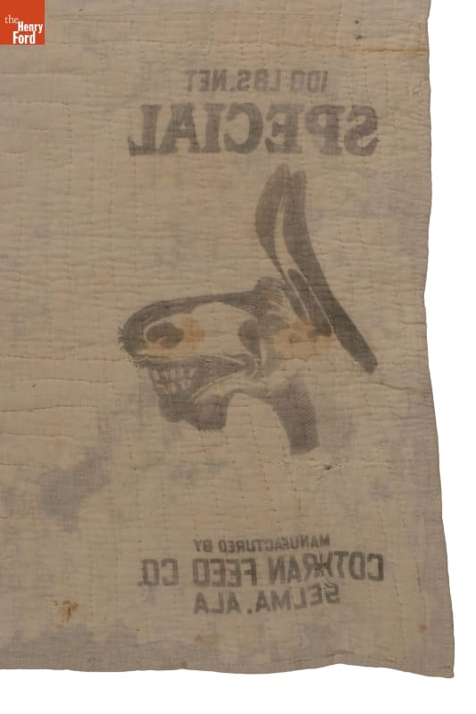 Susana Hunter pieced together her quilts from what she had at hand--old clothing and fabric scraps. This warm quilt, likely made from her husband Julius' worn denim overalls and flannel work shirts, reflected his life as an Alabama tenant farmer. The backing is made from mule feed sacks--mules were often used to pull the farmer's plow.