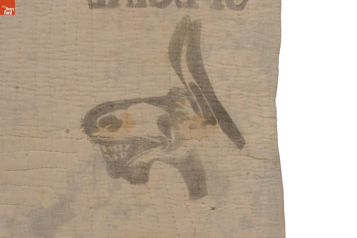 Text, in reverse, printed on feed sack with image of mule, on quilt back:
