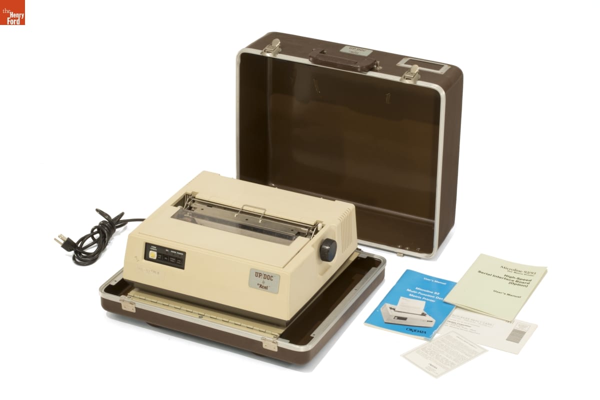 metal label near case handle: UP/DOC BY XCEL metal label on back of machine: Microline 92 Model No. GE 52326 Date MAR. 1983 OKI Electric Industry Co. Ltd. Tokyo, Japan handwritten, front: ML-92 TYPE 4
