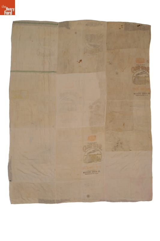 Printed on corn meal sack on backing of quilt: ENRICHED / WHITE CORN MEAL . . . / 25 LBS. NET WEIGHT / CABIN HOME [image of log cabin with well] / ERICHED / WHITE CORN MEAL . OLD STYLE UNBOLTED / MANUFACTURED BY / WESTERN GRAIN CO. / BIRMINGHAM, ALA.