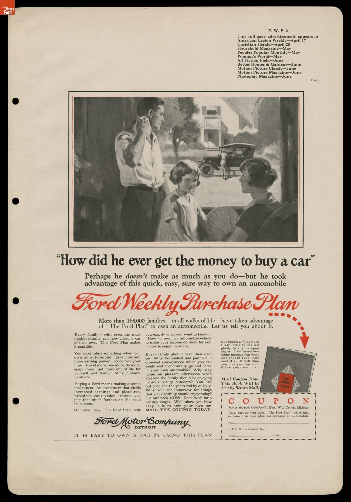At top of page under image: "How did he ever get the money to buy a car" / Perhaps he doesn't make as much as you do--but he took / advantage of this quick, easy, sure way to own an automobile / Ford Weekly Purchase Plan / More than 165,000 families--in all walks of life--have token advantage / of "The Ford Plan" to own an automobile. Let us tell you about it...