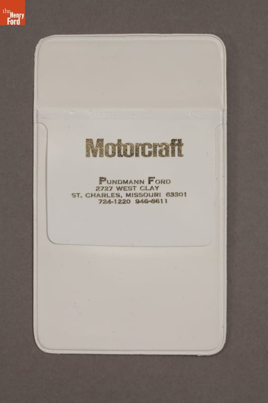 In gold, on front flap of pocket protector: MOTORCRAFT / PUNDMANN FORD / 2727 WEST CLAY / ST. CHARLES, MISSOURI 63301 / 724-1220 943-5611