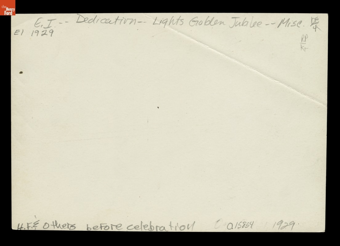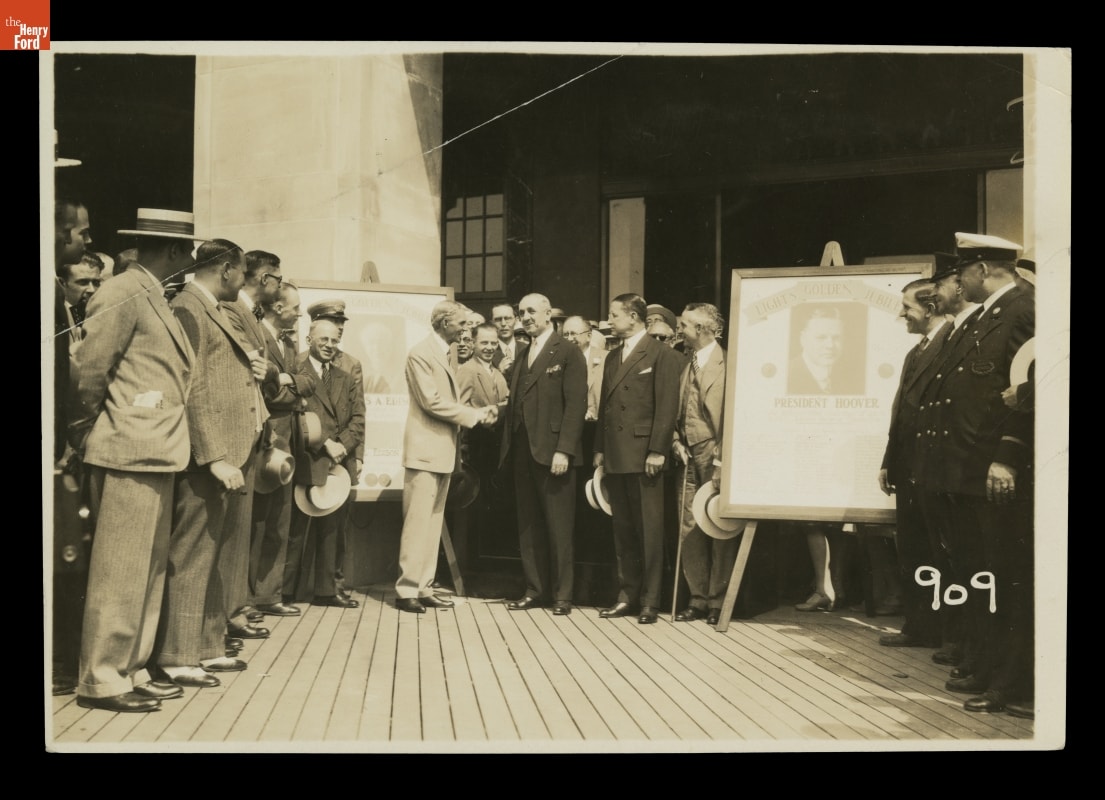 On October 21, 1929, Henry Ford hosted an elaborate celebration in Dearborn, Michigan, to honor his friend Thomas A. Edison. Known as Light's Golden Jubilee, the event marked the 50th anniversary of Edison's invention of the first practical incandescent electric lamp. This photograph shows Henry Ford greeting a number of distinguished invited guests.