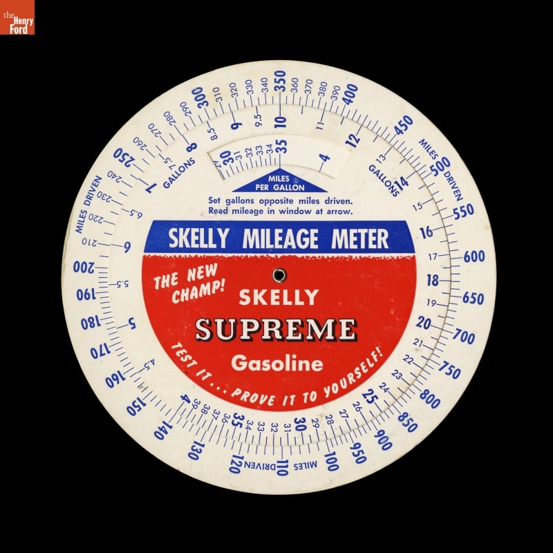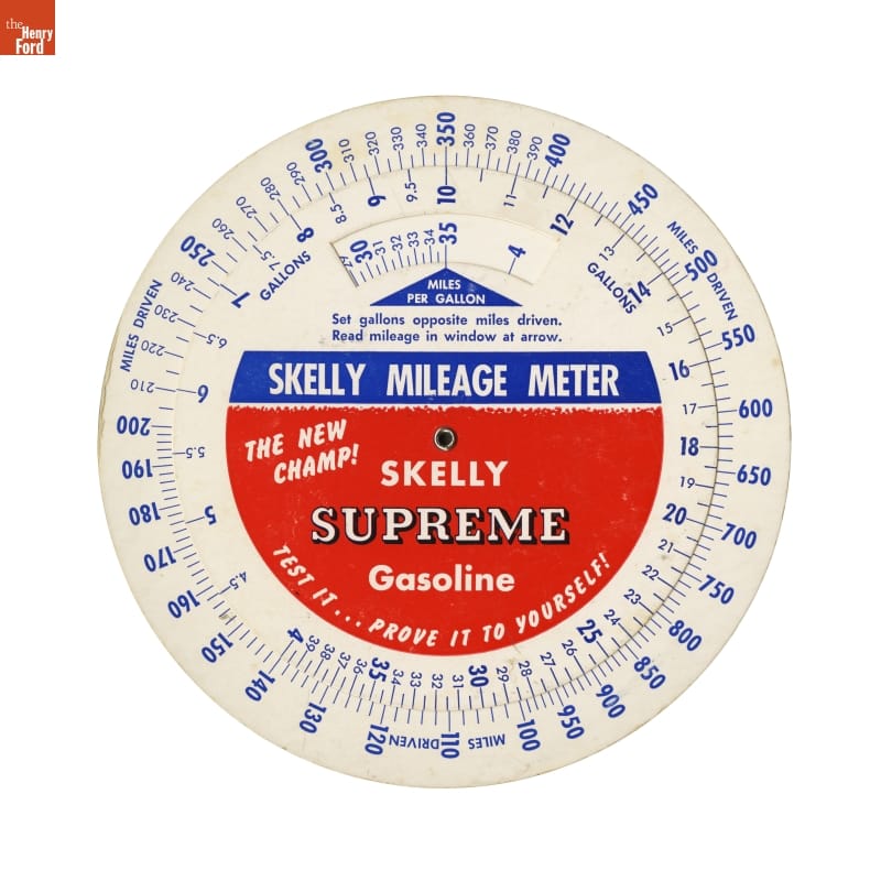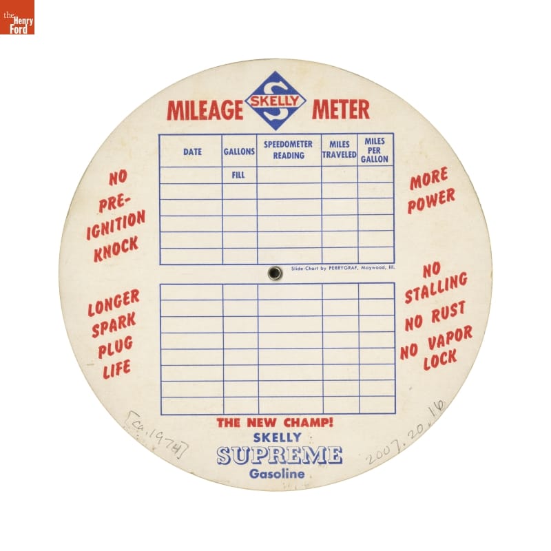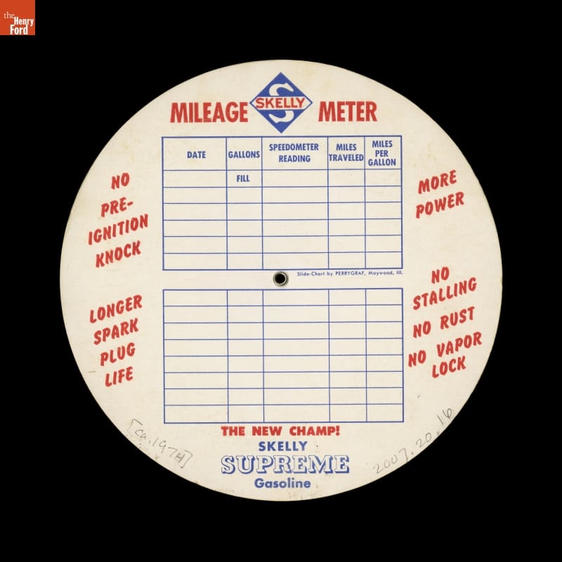 Although not new, mileage calculators became much more popular during the gasoline crisis in the 1970s. In addition to calculating miles per gallon, this Skelly giveaway contains a mileage record on the back, proclaiming it is "The New Champ!" in fuel economy.