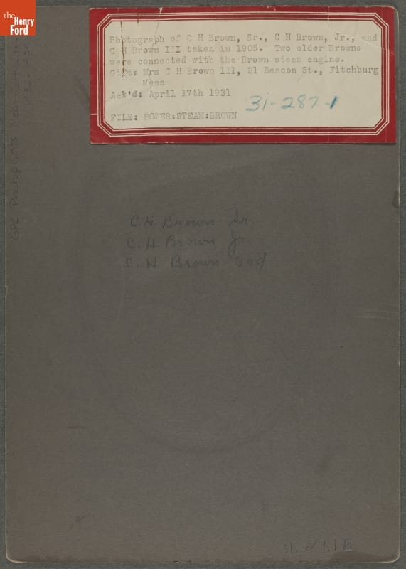 C.H. Brown and Company, founded in the late 1860s, built steam engines used by mill owners and machine manufacturers throughout America. Thomas Edison even purchased a Brown steam engine to run electric dynamos at Menlo Park. Pictured in this 1905 photograph is founder Charles. H. Brown, Sr., his son Charles, Jr., and his grandson Charles III standing in the center.