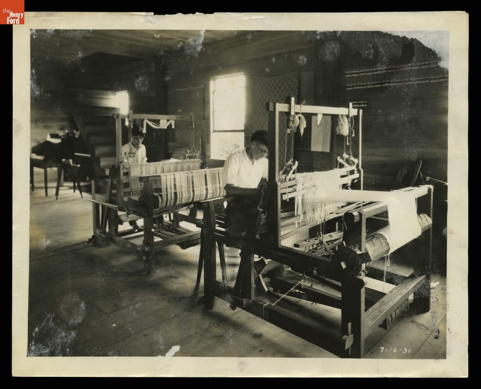 Henry Ford believed in "learning by doing." Students enrolled in the Edison Institute Schools located on the grounds of Ford's Greenfield Village had ample opportunities for practical, hands-on training. Students, if they desired, could learn to weave. Beginners used small tabletop looms. As they progressed students created woven materials using larger looms located in Greenfield Village's Plymouth Carding Mill and Weaving Shed.