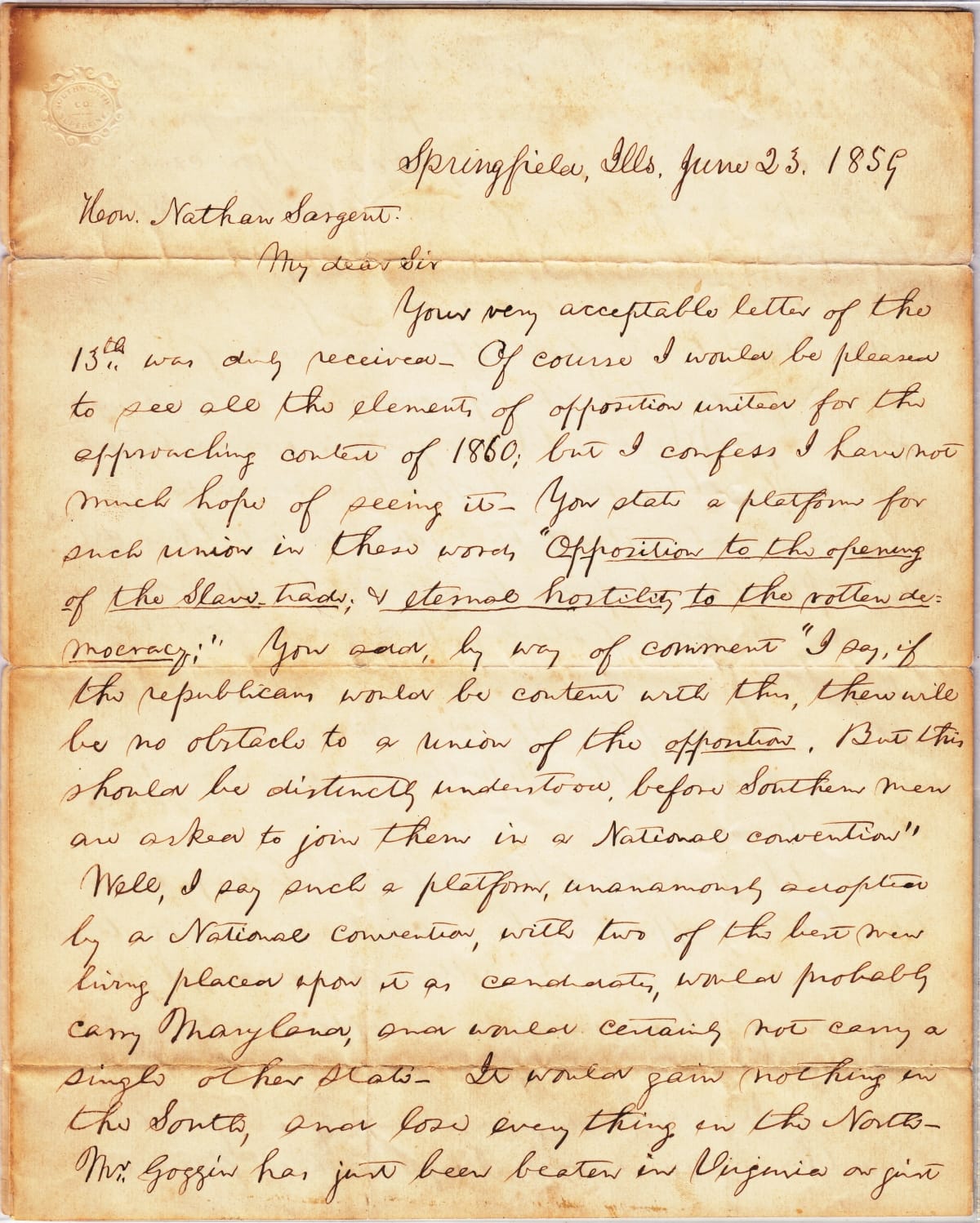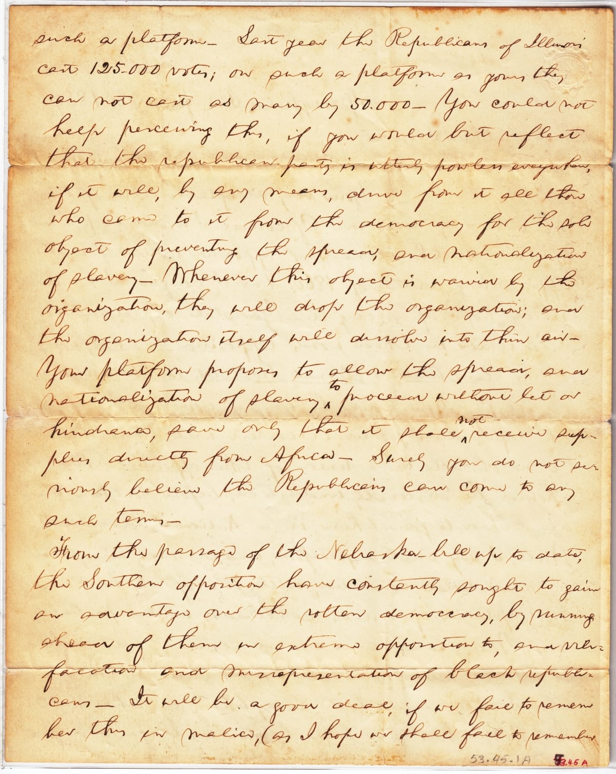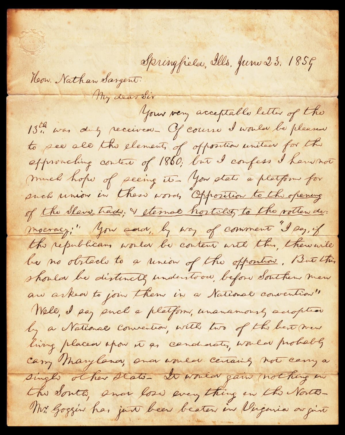 This 1859 letter to Nathan Sargent, a fellow member of the emerging Republican Party, lays out Abraham Lincoln's rapidly crystallizing views on the question of extending slavery to new states. Lincoln foresees a proposed moderation in the Republican platform--allowing the spread of slavery unhindered--as working against the Party's chances in the North in the upcoming 1860 presidential election.