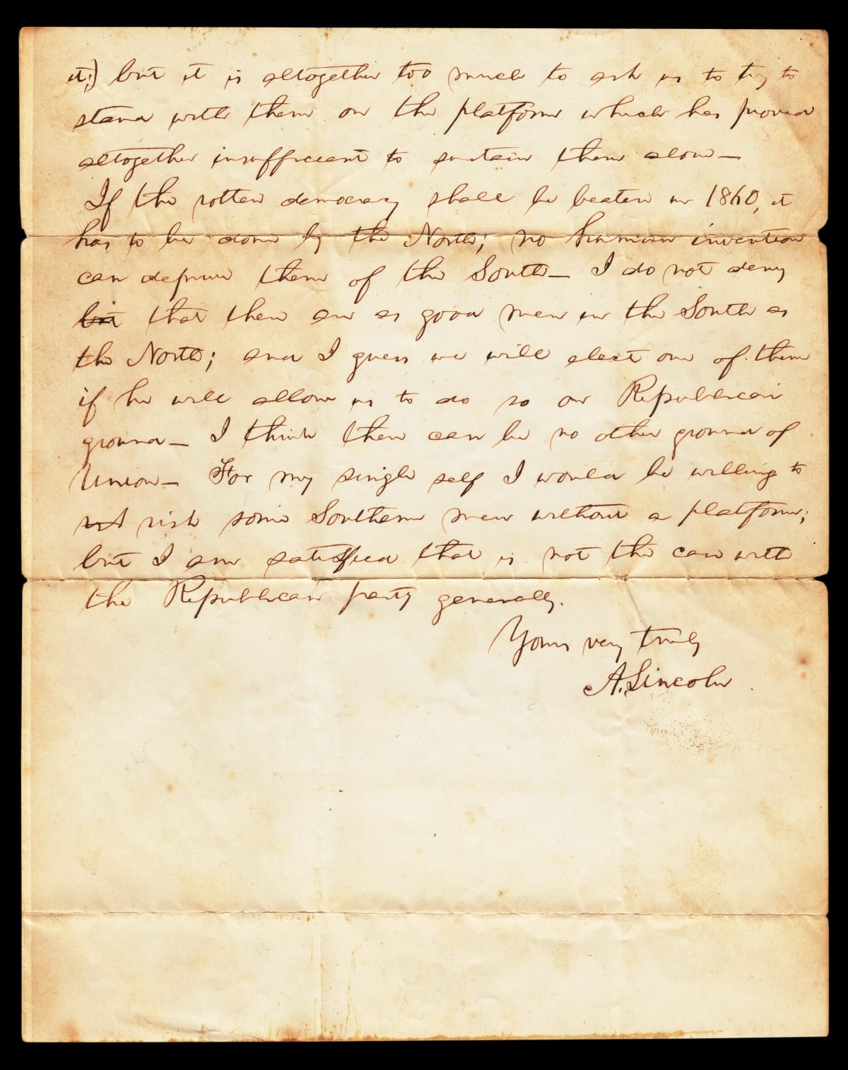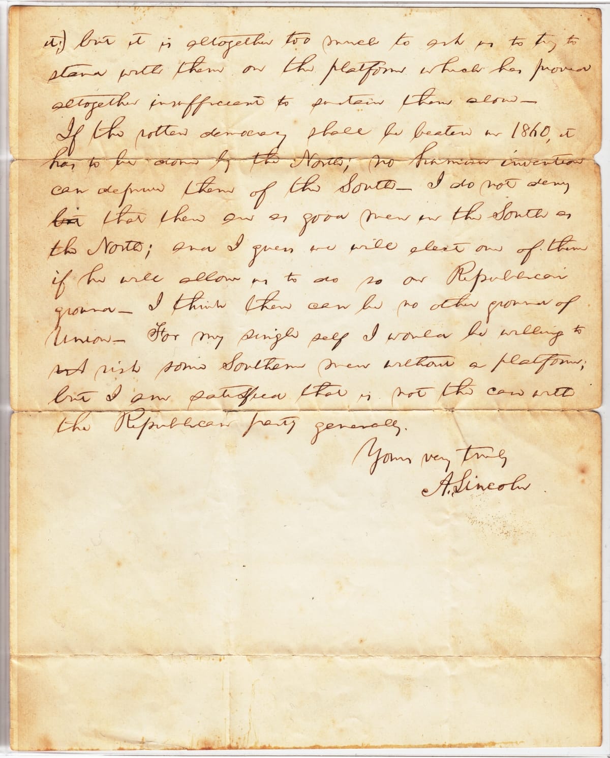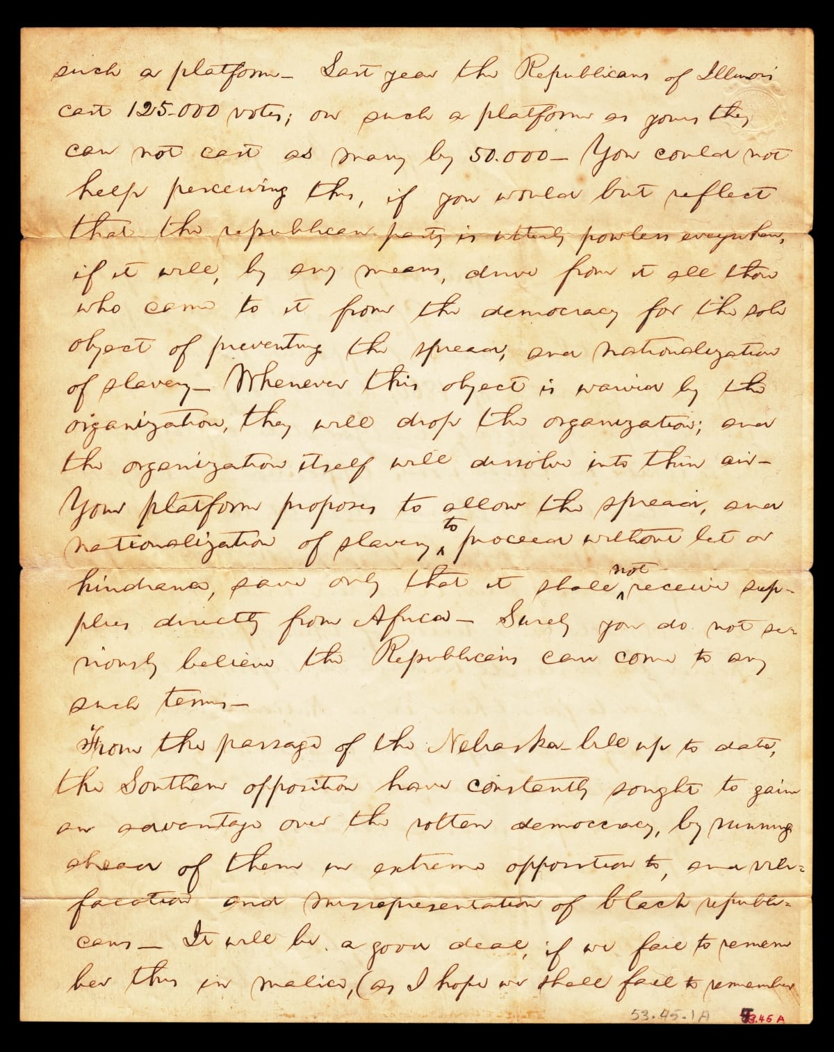 This 1859 letter to Nathan Sargent, a fellow member of the emerging Republican Party, lays out Abraham Lincoln's rapidly crystallizing views on the question of extending slavery to new states. Lincoln foresees a proposed moderation in the Republican platform--allowing the spread of slavery unhindered--as working against the Party's chances in the North in the upcoming 1860 presidential election.